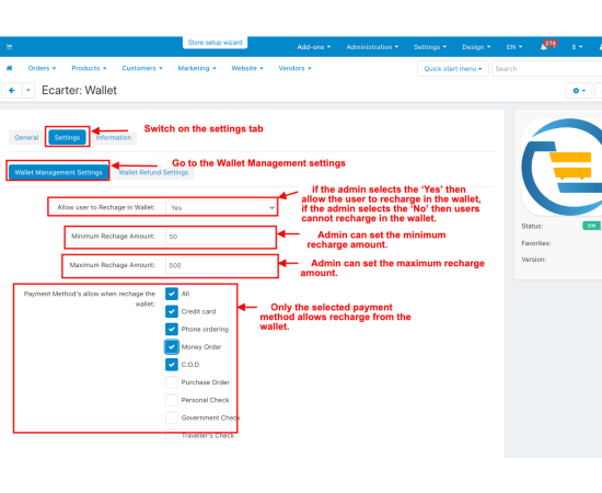 - Wallet Management: Set minimum and maximum recharge amounts, and Select specific payment methods for wallet recharge.
