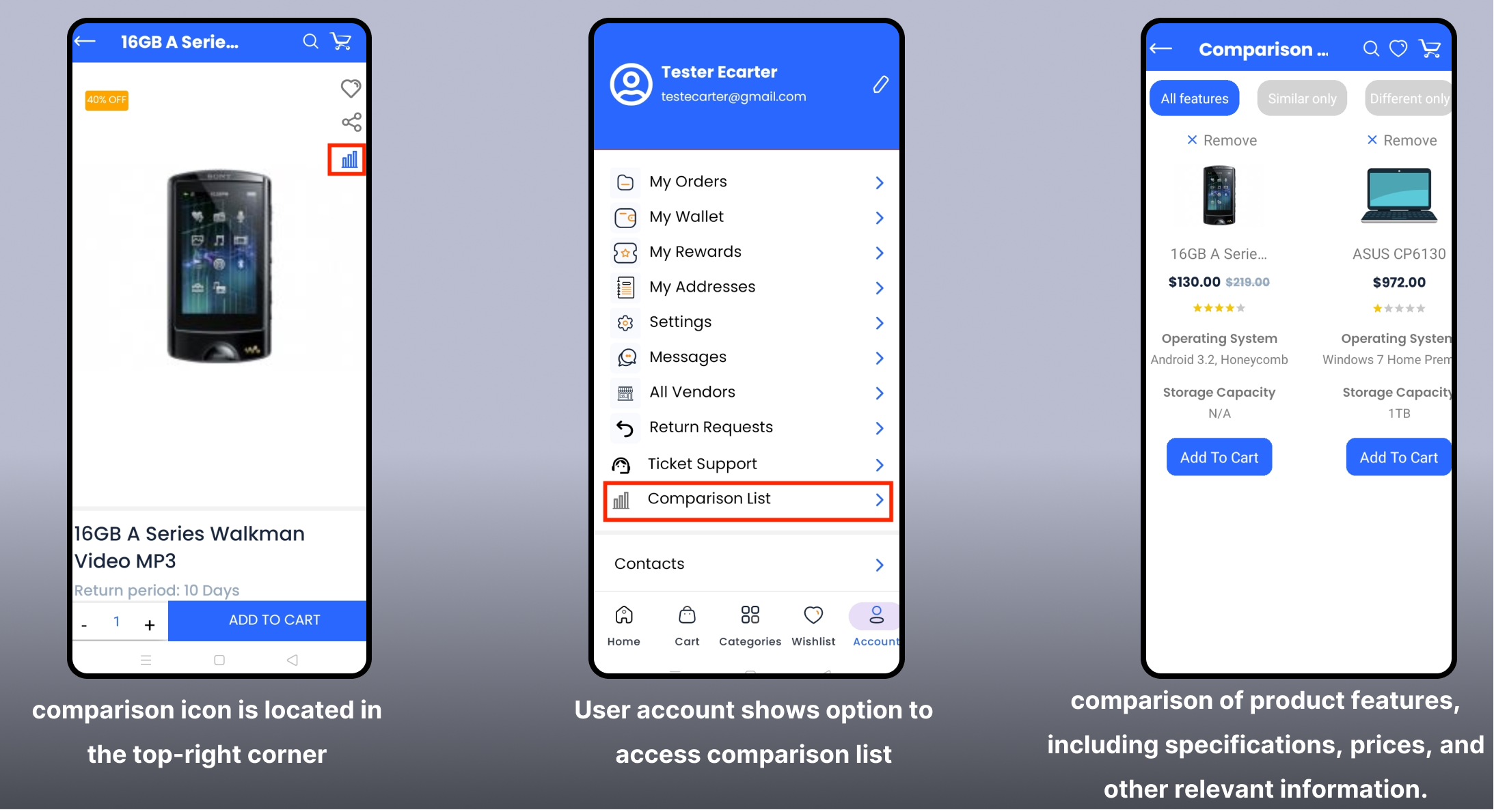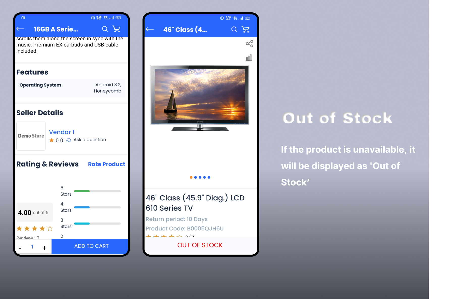 Products are listed within various categories, sorts, filters, grid view, and list view on the home screen. Each product shows detailed information such as price, rating, vendor, and description. also users can directly use wishlist sharing and comparison icons. You can use the "Add to Cart" button for available items, but it will not be shown for "Out-of-stock" products.