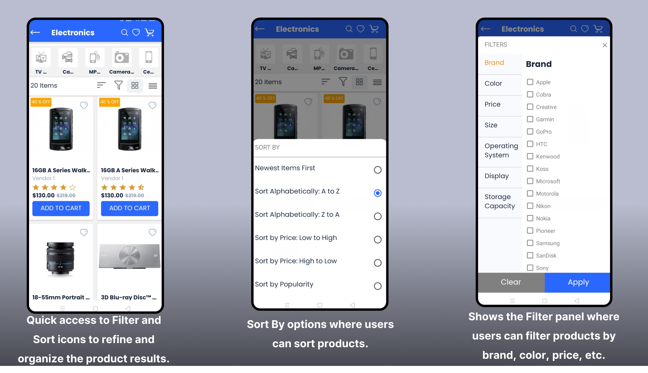 The product list page shows two icons: "Sort" and "Filter". The "Sort" option allows users to arrange products by name, price, or popularity. The "Filter" option helps users to find and organize products by brand, color, display, or storage.