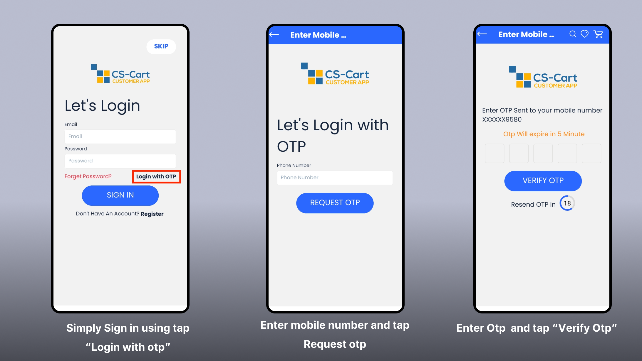 On the login screen, users can choose to login with OTP. To do this, they need to click on Login with OTP. A new screen will appear where the user enters their mobile number and clicks on Request OTP. The user will then receive an OTP on the entered mobile number. After receiving the OTP, the user must enter the OTP and click on Verify OTP. If the OTP is verified successfully, the user will be logged in. Afterward, the user can complete their profile.