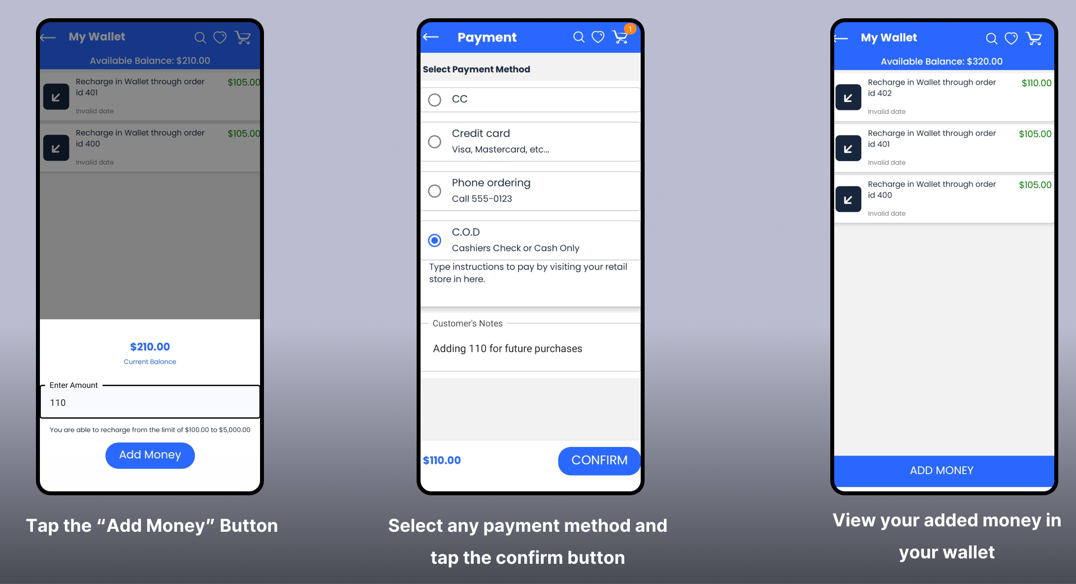Step 3: Select the payment method and click the confirm button. After successful payment, the money is added to the user's wallet. Now, on the next page, you can see the order details. Also, you can find the latest wallet transactions in the My Wallet transaction list.