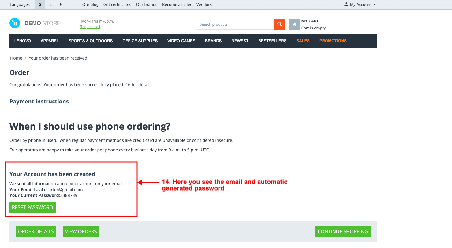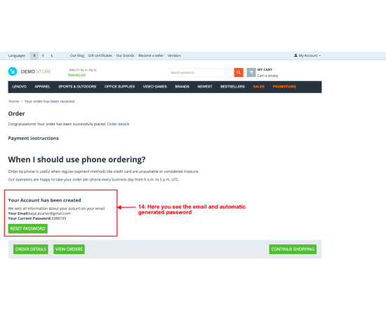 The system utilizes the email provided by the guest user during checkout to generate a random password, and the user's email along with the login details are conveniently displayed on the order detail page. This efficient process not only ensures a swift account setup but also enhances the overall user experience, allowing customers to easily access their account information for future use.
