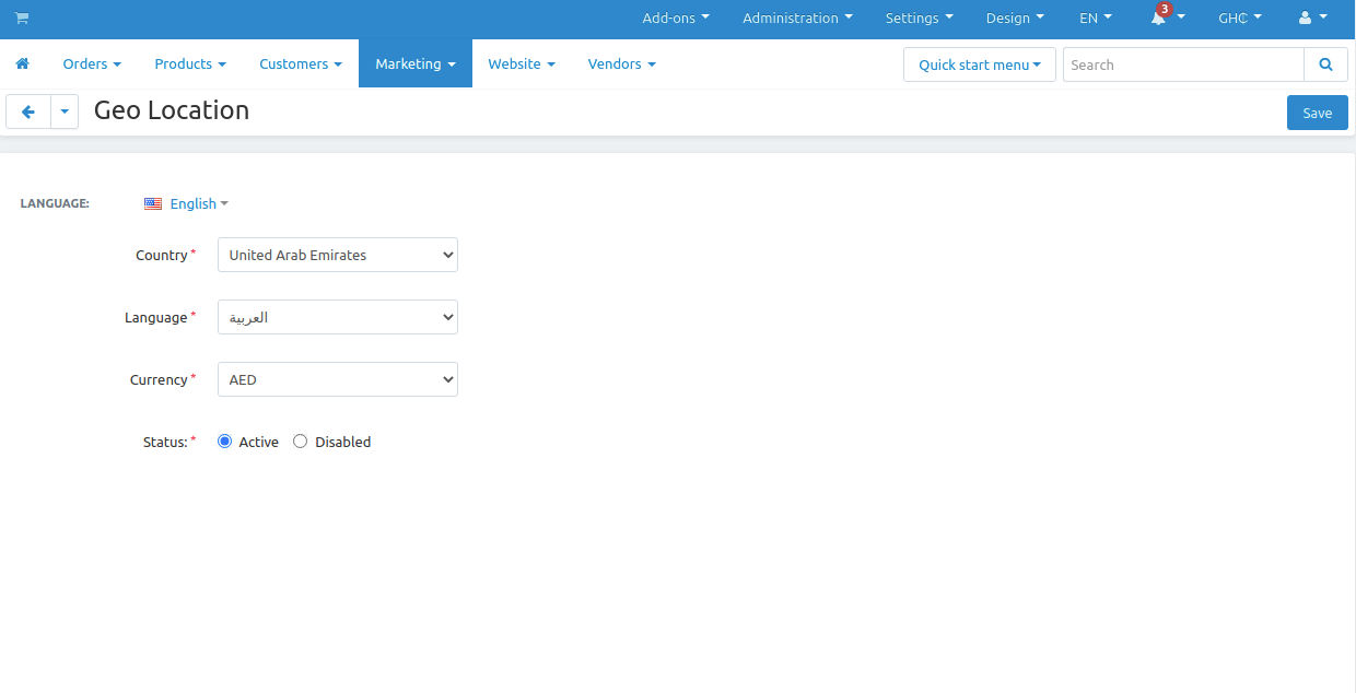The addon provides functionality to set store language and currency according to the country from the admin panel, where the admin can create a list of Geo-Location in Marketing > Geo Location for different countries set a respective language and currency for that country where he is able to select language and currency from all active language and currency of the store.