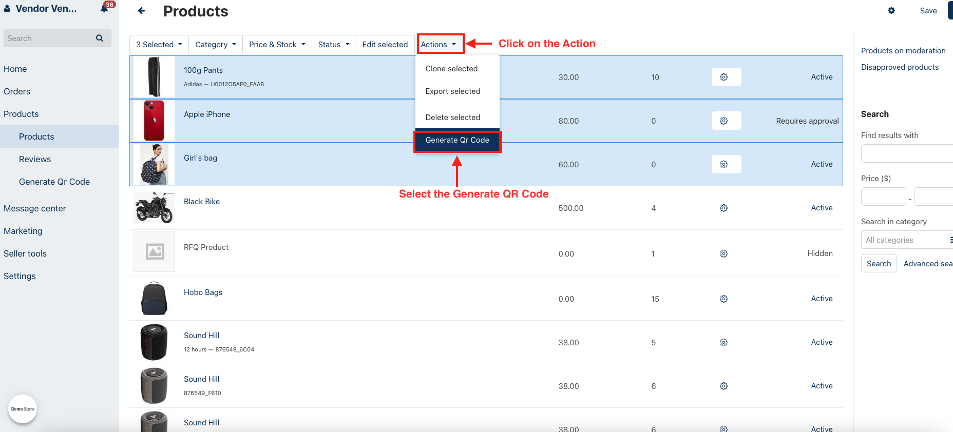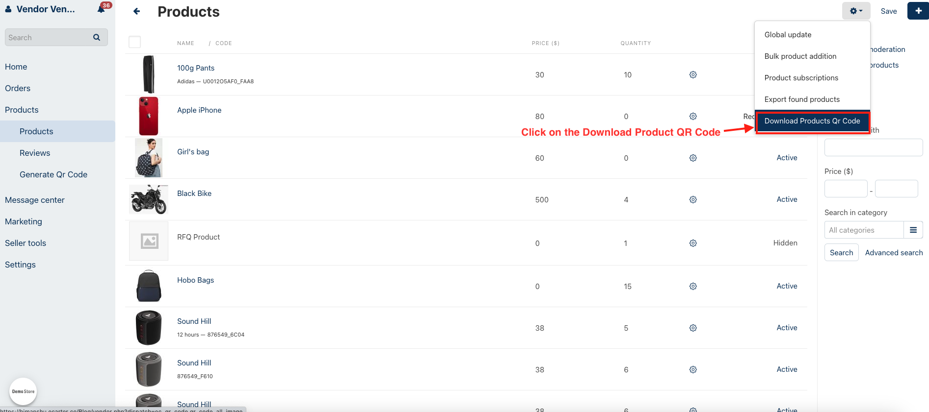 - Go to Products and click on >> Generate QR code. The product QR code list will be open.