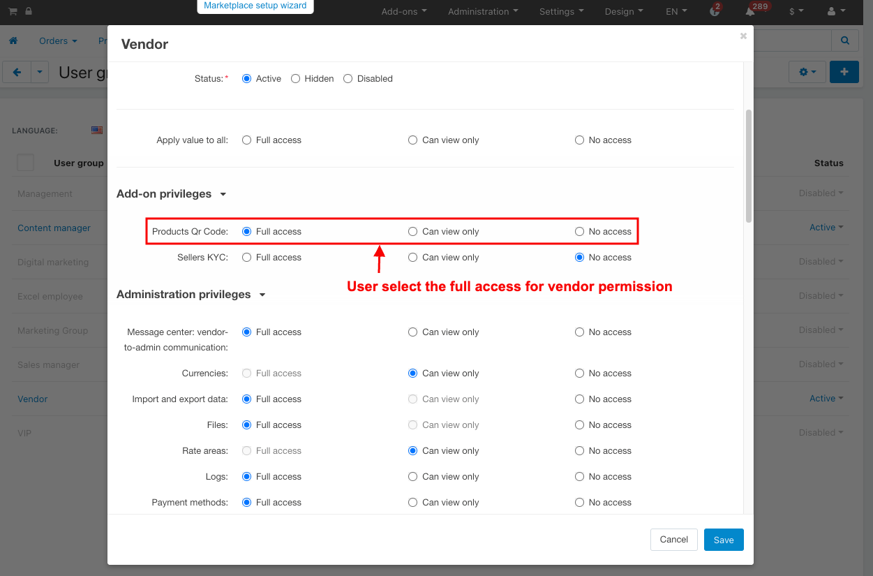 - Product QR code: User select the full access for vendor permission.