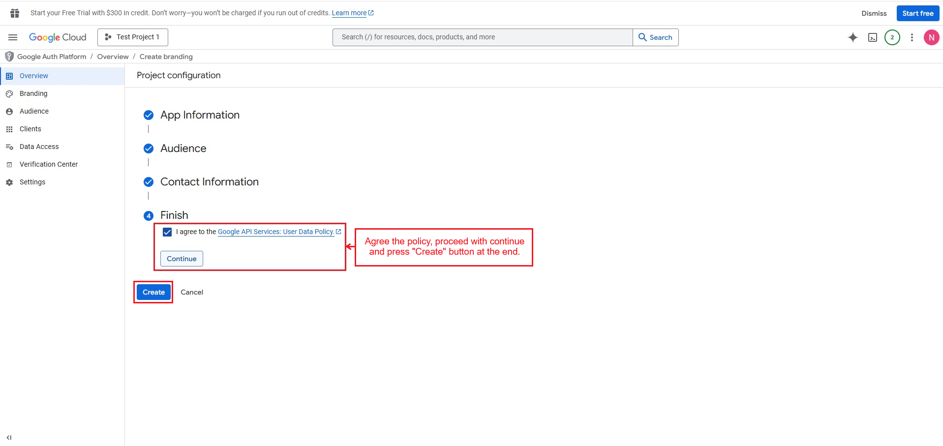 Agree the policy, proceed with continue and press "Create" button at the end.