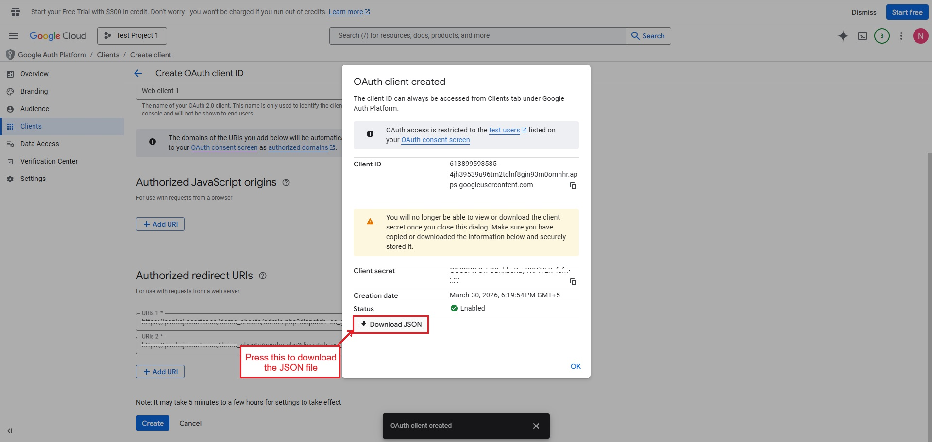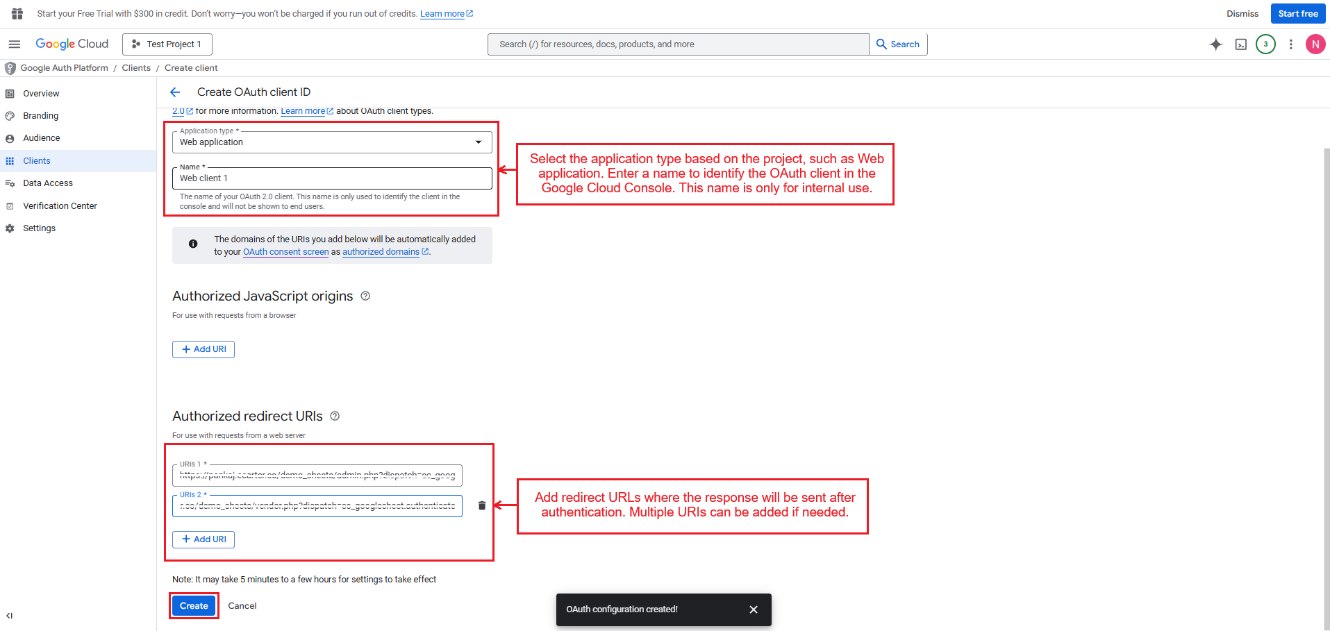 Add redirect URLs where the response will be sent after authentication. Multiple URIs can be added if needed.
