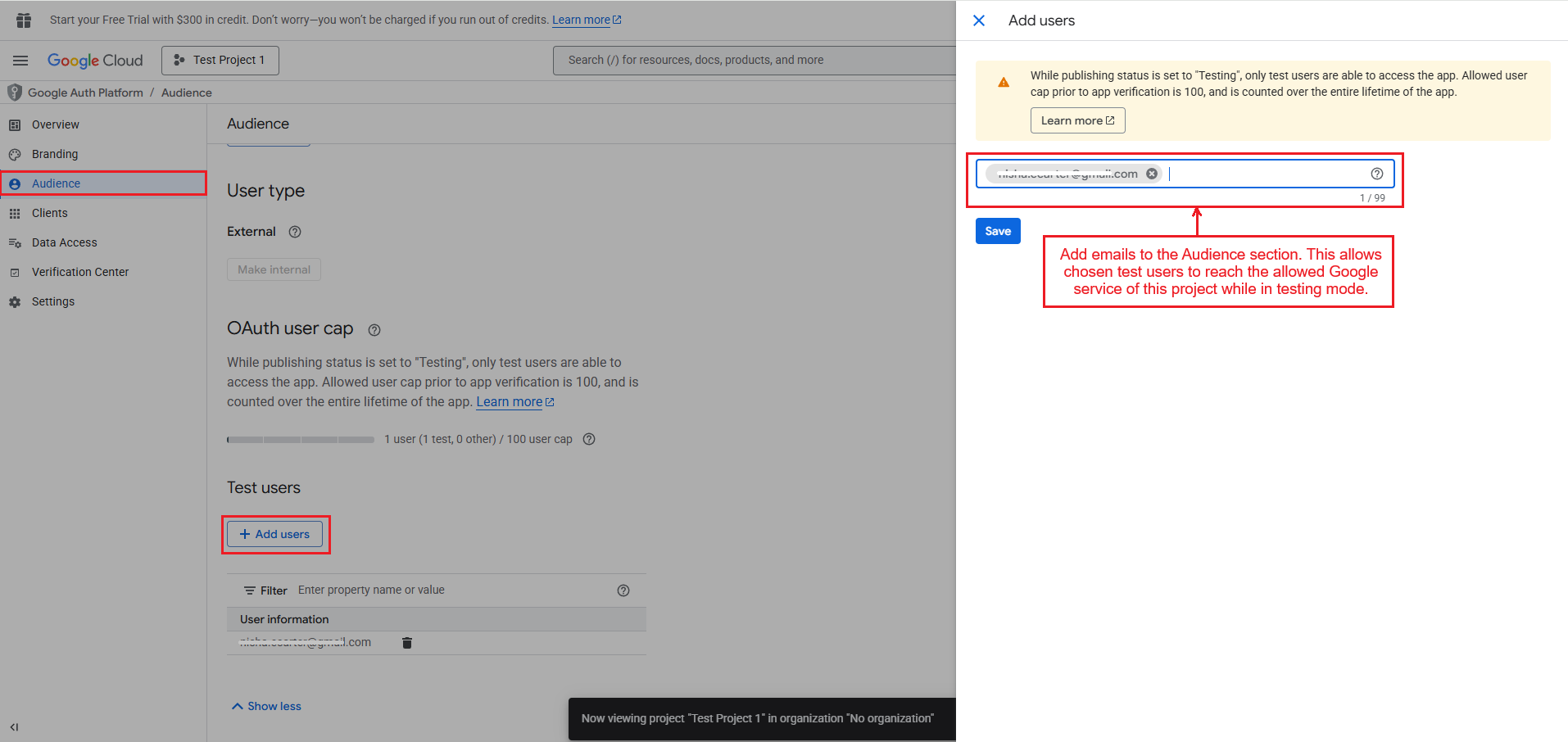 Also, add emails in the Audience section to allow selected test users to access the approved Google service during testing mode.