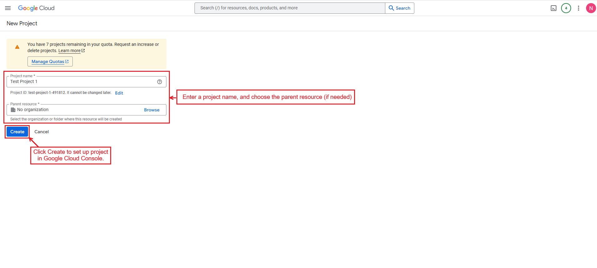 Enter a project name, choose the parent resource (if needed), and click Create to set up your project in Google Cloud Console.