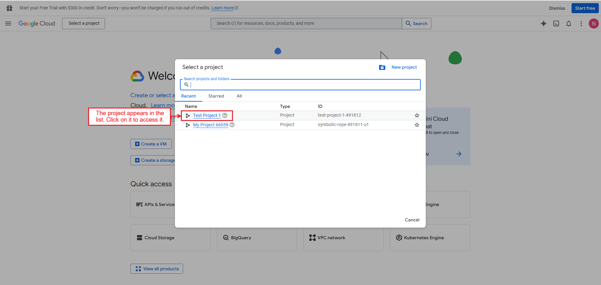 The newly created project appears in the list. Click on it to access it.