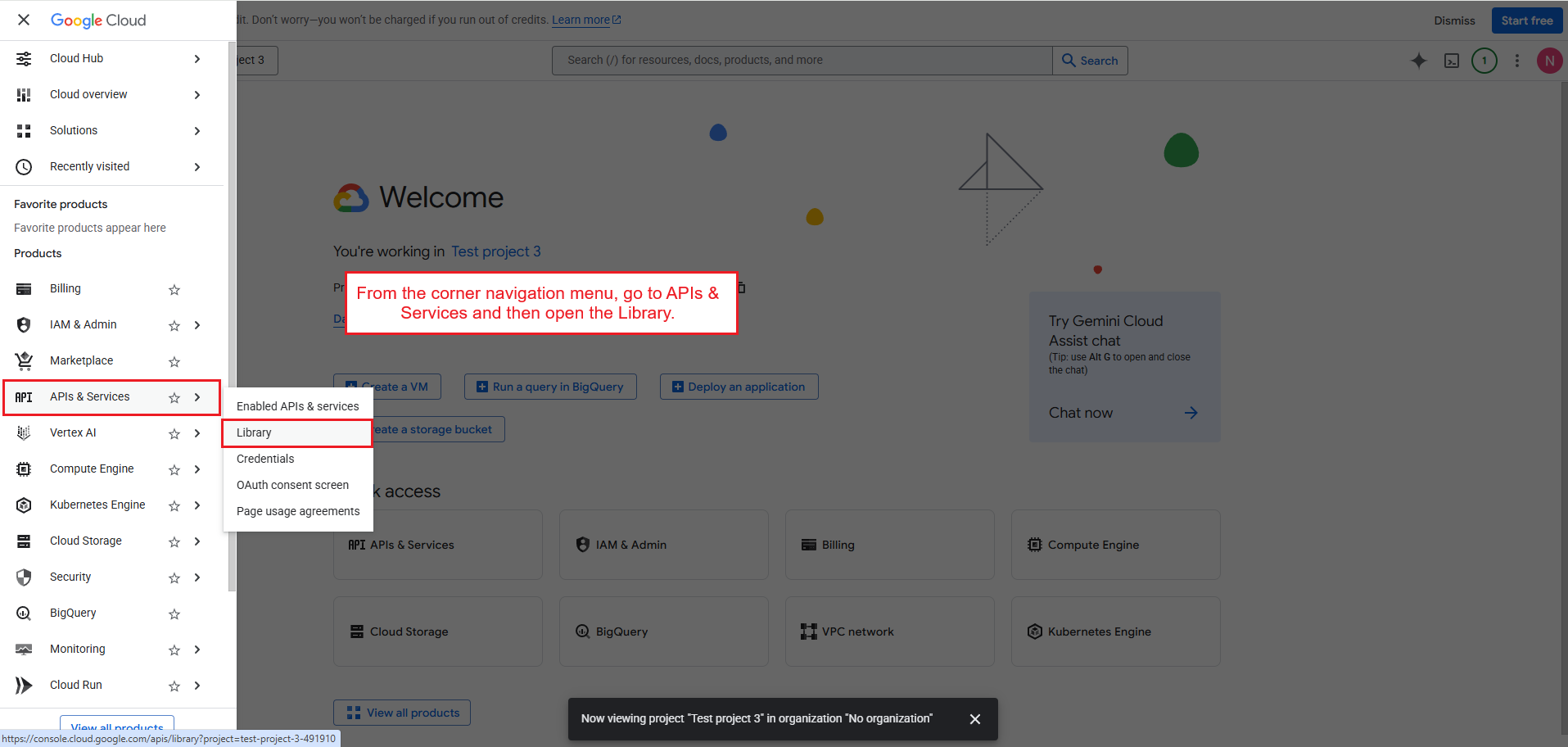 From the corner navigation menu, go to APIs & Services and then open the Library.