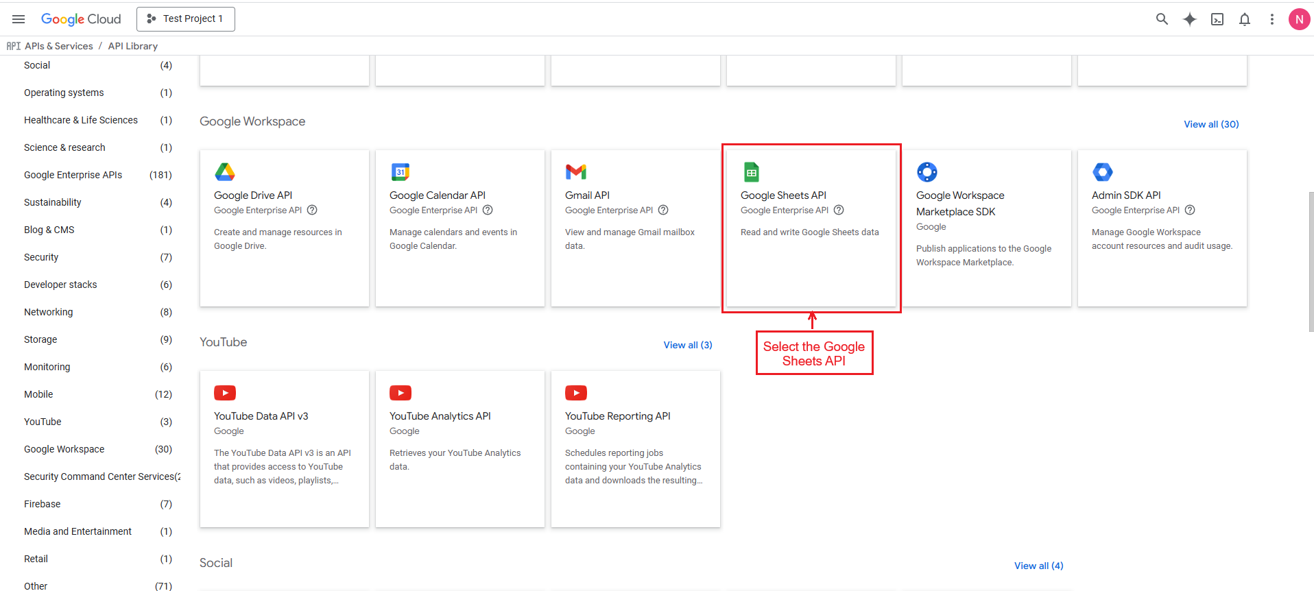 Select the Google Sheets API.