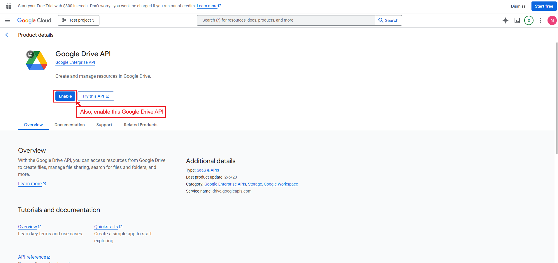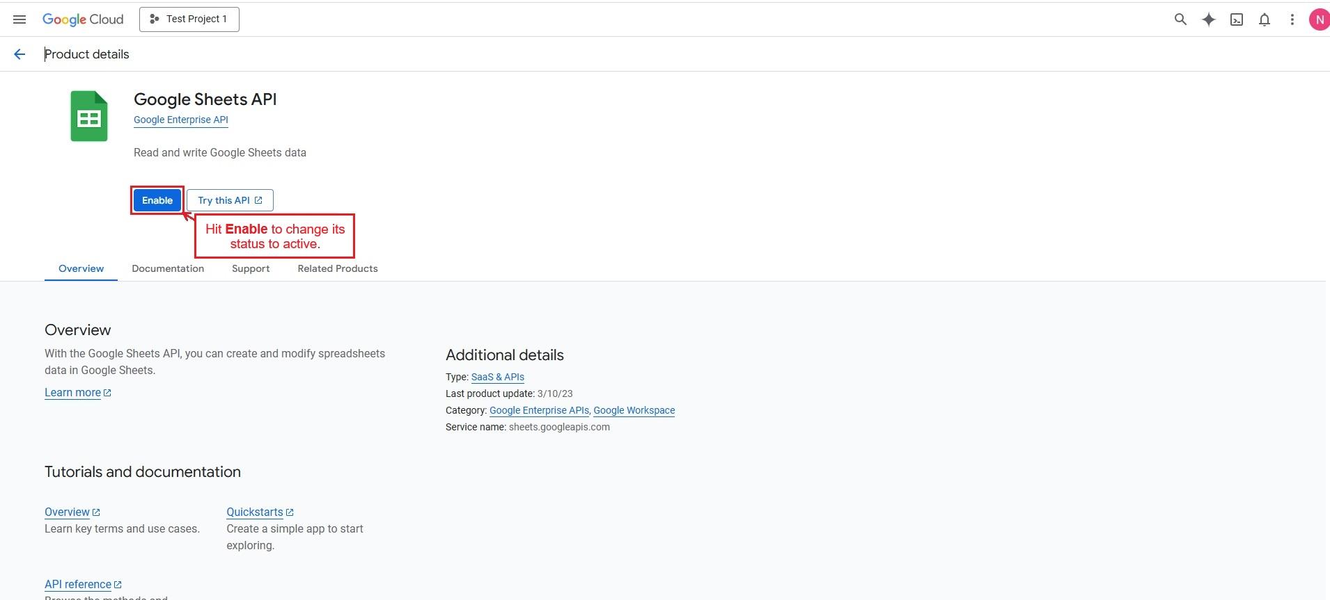 Also, enable the Google Drive API to access and manage Google Sheets files stored in Google Drive.