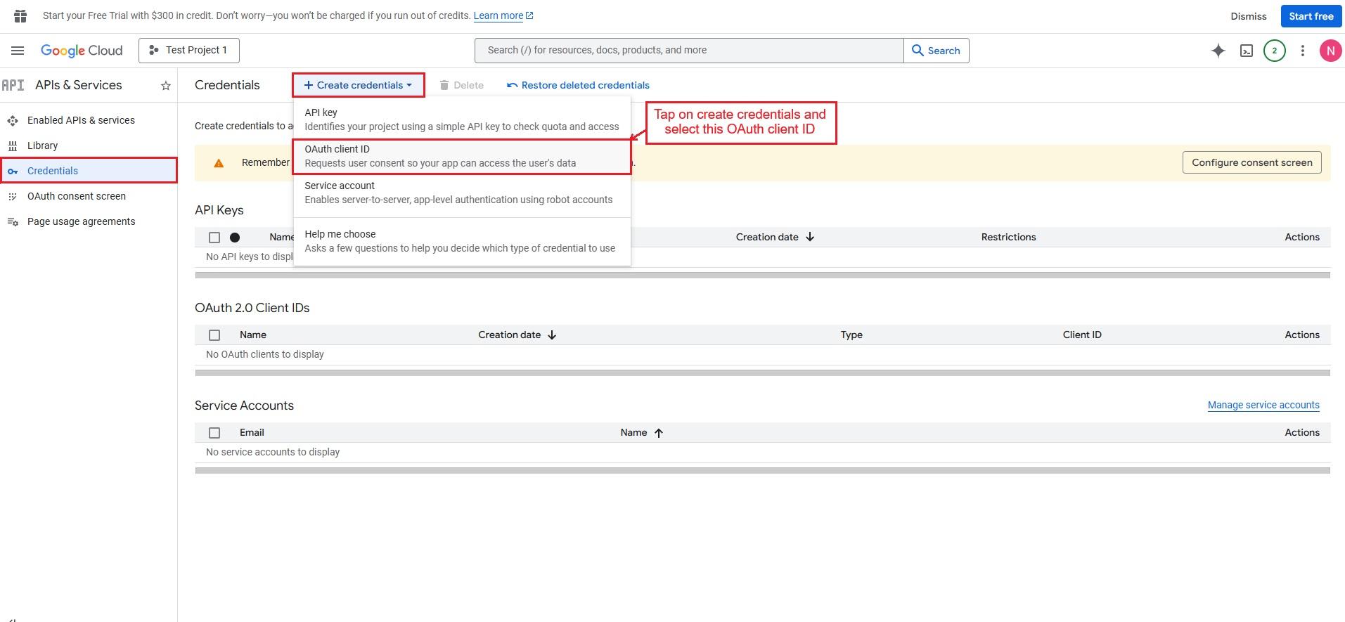 Now, select the Credentials options, tap on Create credentials, and select the OAuth client ID.