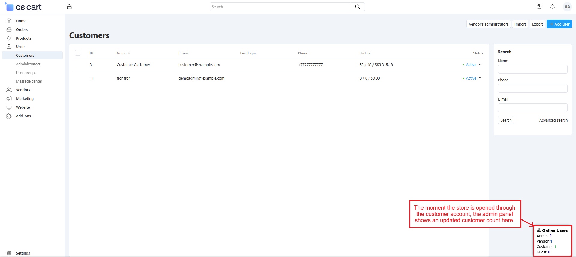 Tracks Active Users: The add-on shows which Admins, Vendors, Customers, and Guests are currently online in real time.