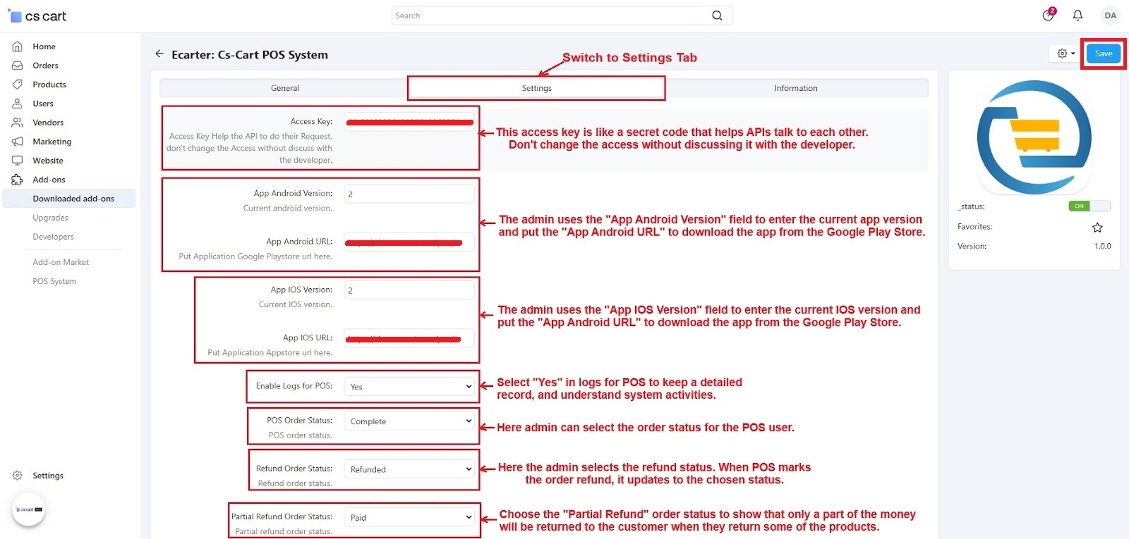 Enable logs for POS: Select “Yes” in logs for POS to keep a detailed record, and understand system activities.