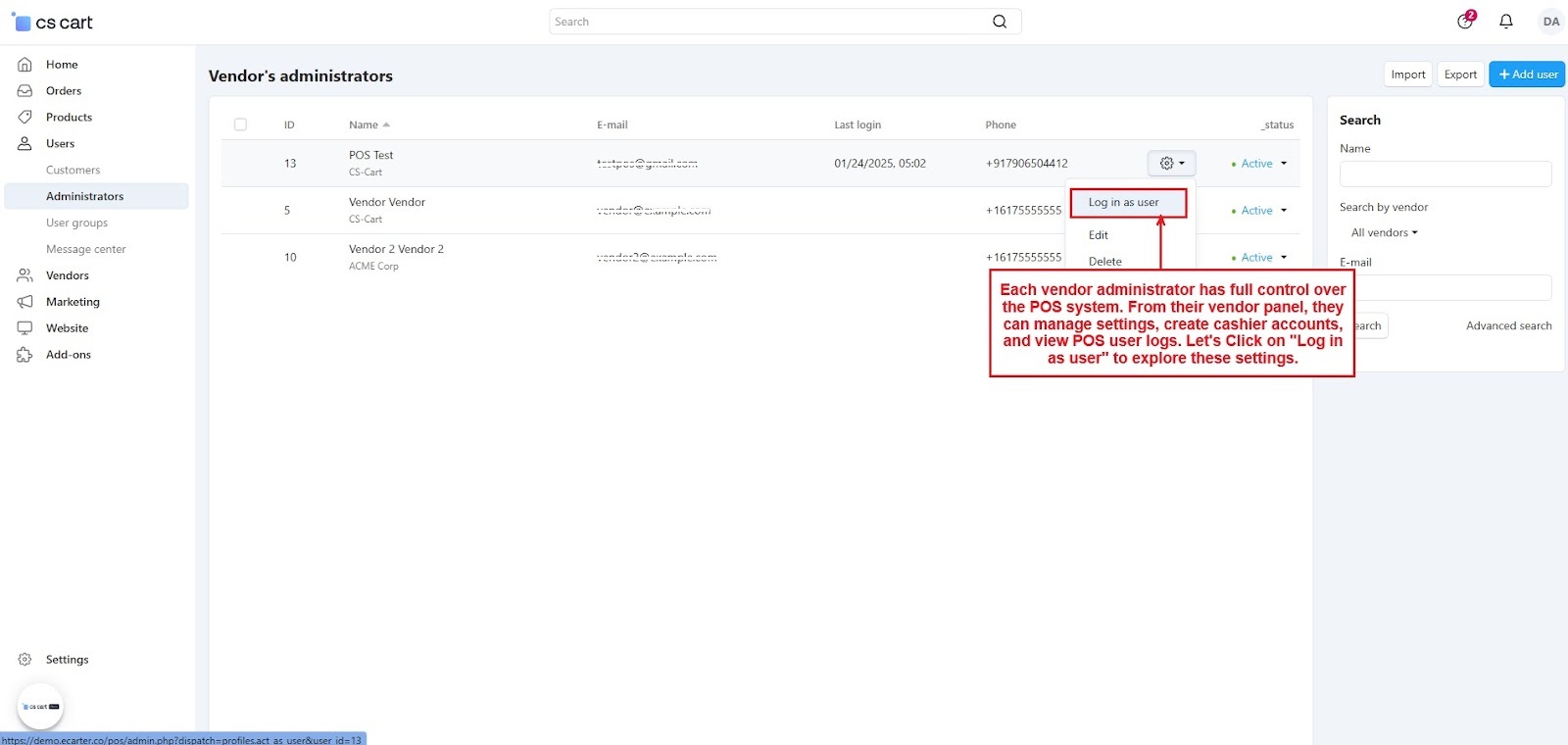 Each vendor administrator has full control over the POS system. From their vendor panel, they can manage settings, create cashier accounts, and view POS user logs.