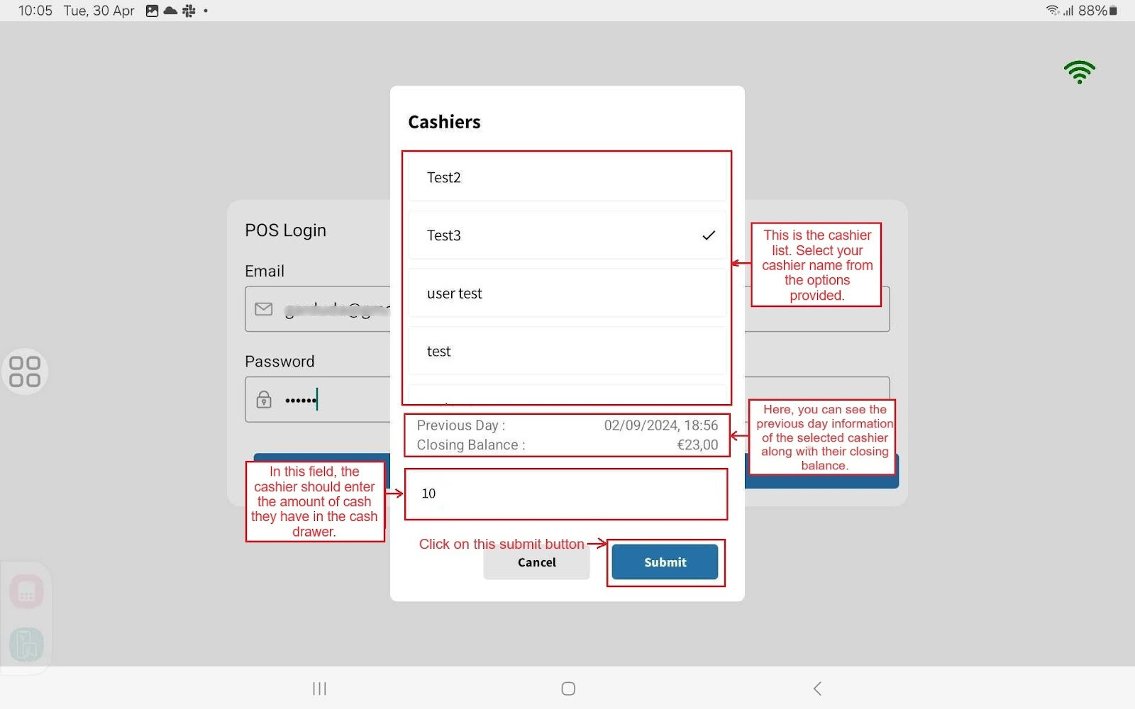 This page also shows the previous day’s information of the selected cashier along with their closing balance.