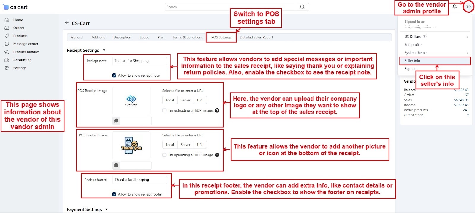 Vendor admin can customize its POS settings within the vendor panel as well. This includes setting receipt notes and images, payment details, email templates, and setting up POS tips.