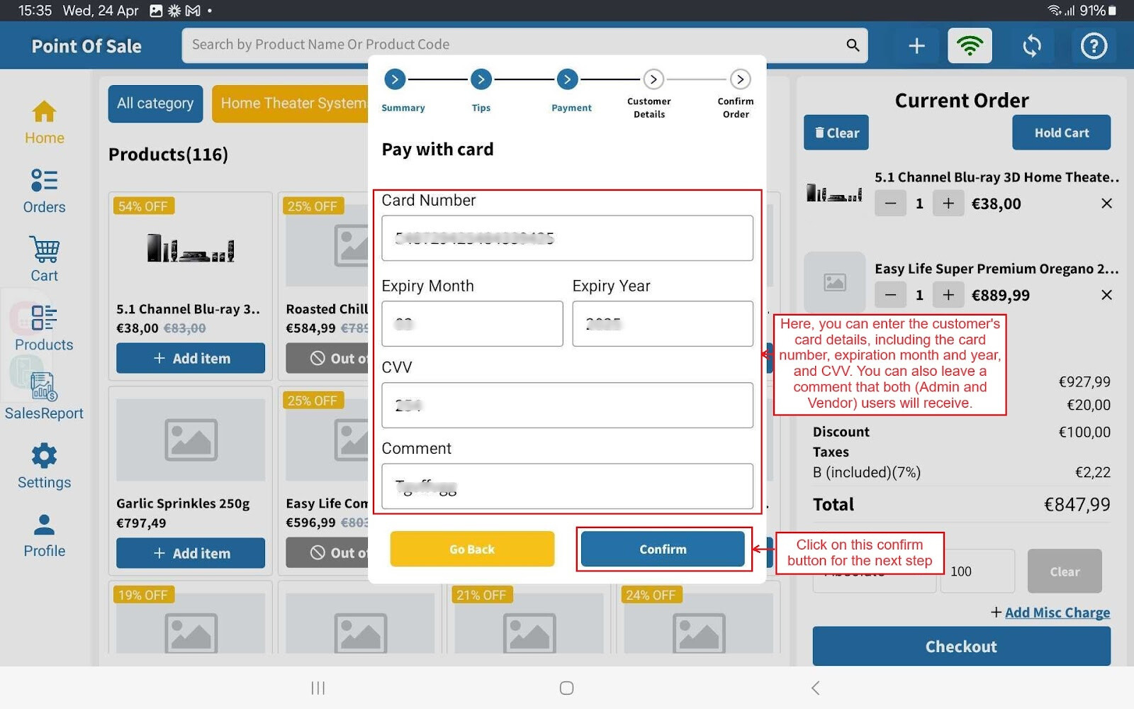 Here, you can enter the customer’s card details, including the Card number, expiration month,year, and CVV. You can also leave a Comment that both (Admin and Vendor) panel users will receive.