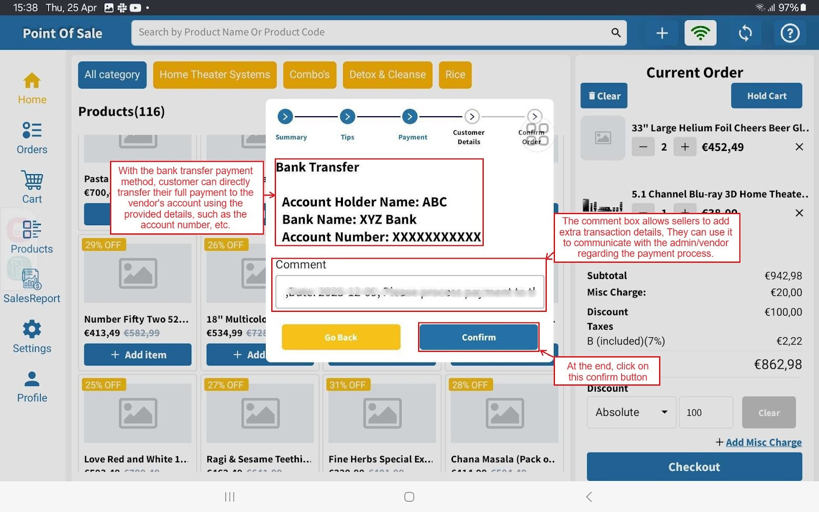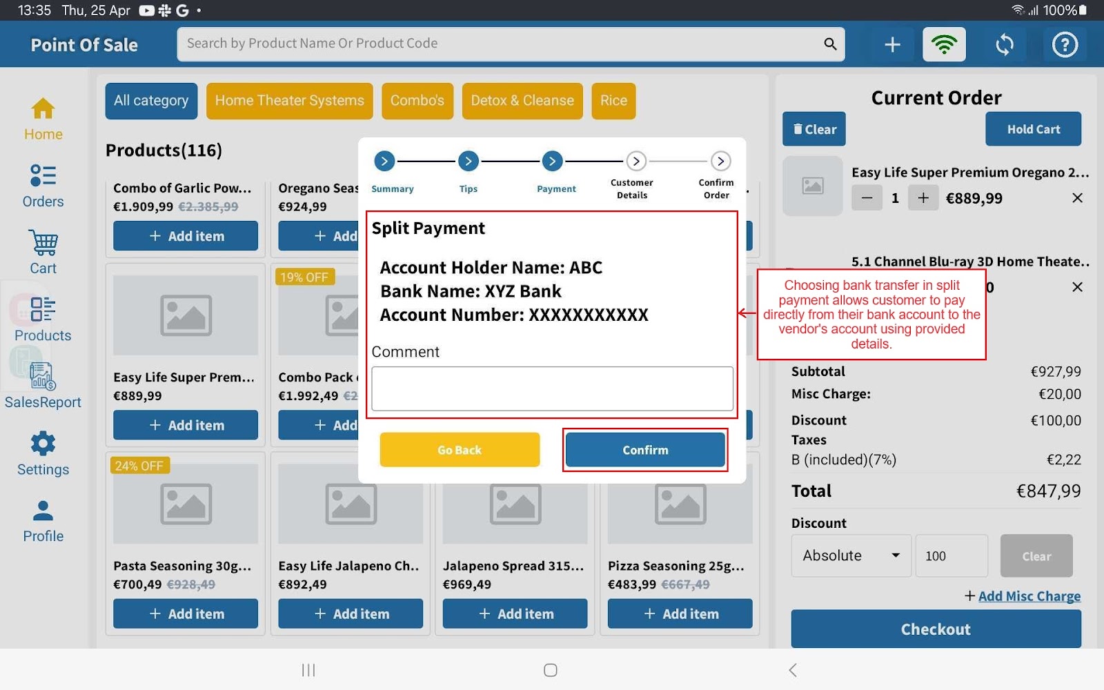 Choosing bank transfer in split payment allows customers to pay the other half directly from their bank account to the vendor's account. They can also add a comment in the comment field.