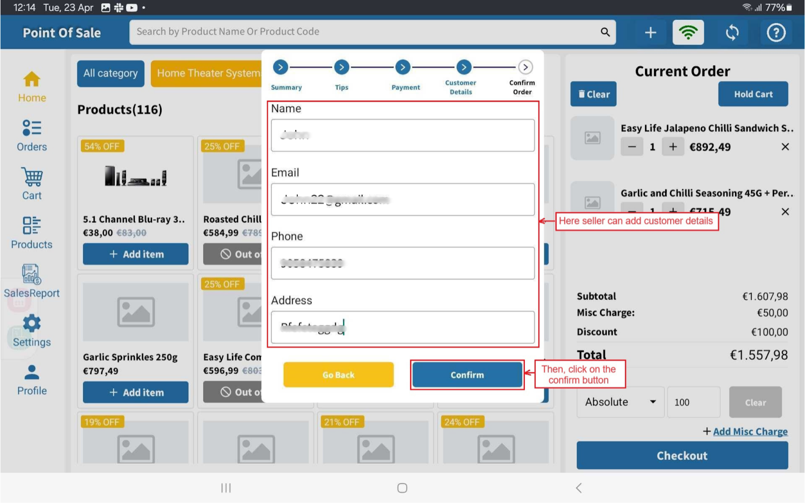 Now, In the Tip Options window, customers can add extra money to show appreciation for good service. They can choose from different options: None, Round, Given Tips or Other. The seller selects the one the customer prefers.