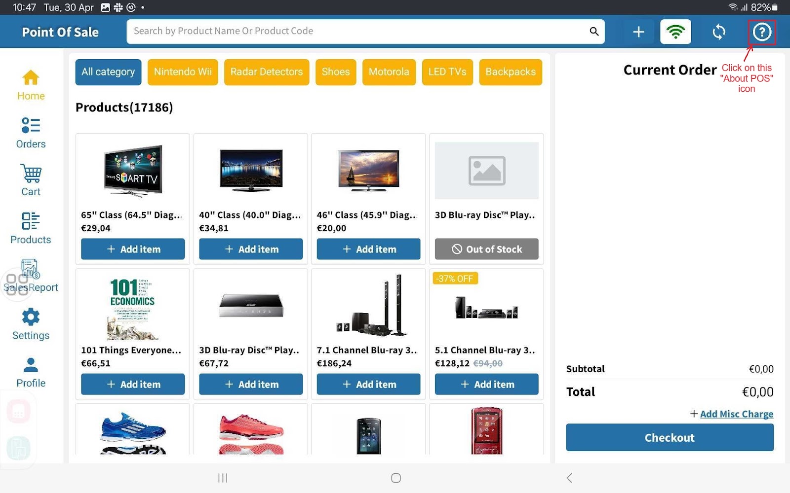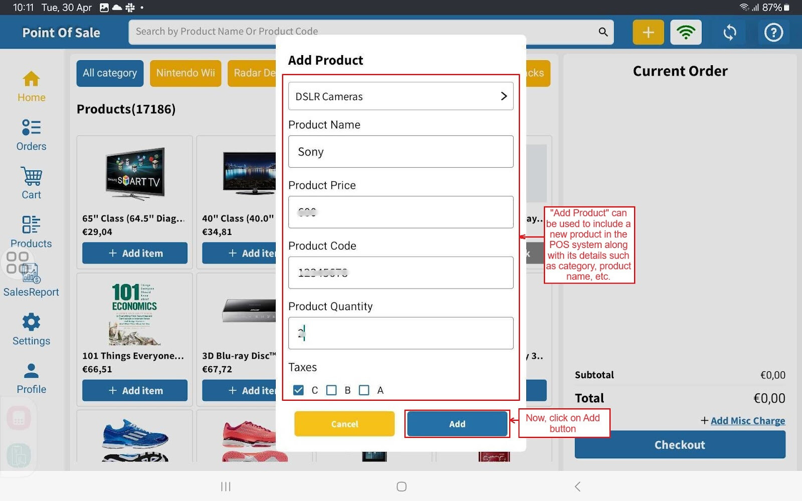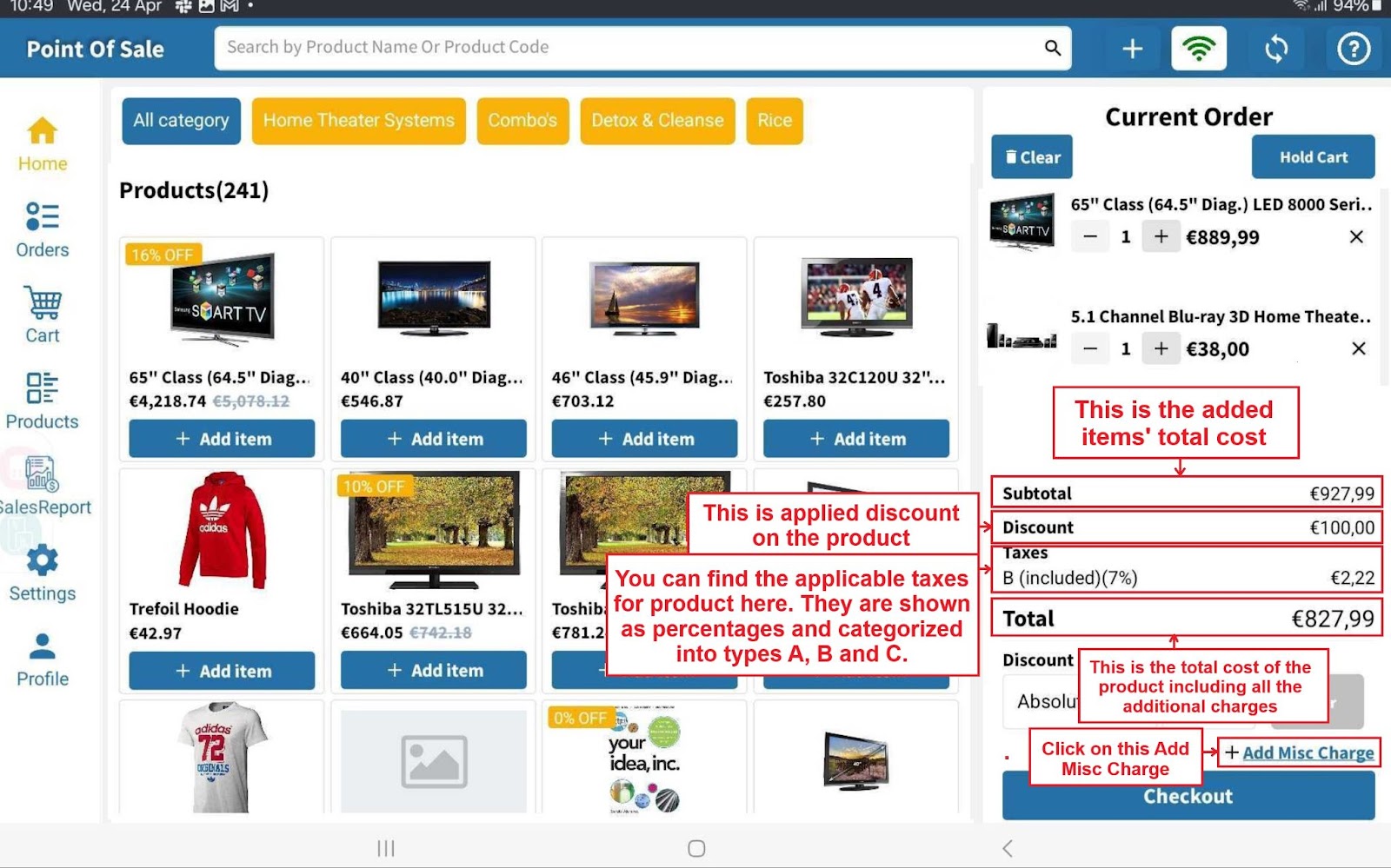 Taxes: Some products in the store already have set taxes. You can see the tax on products after selecting them. Those are shown as percentages and categorized into types A, B, and C.