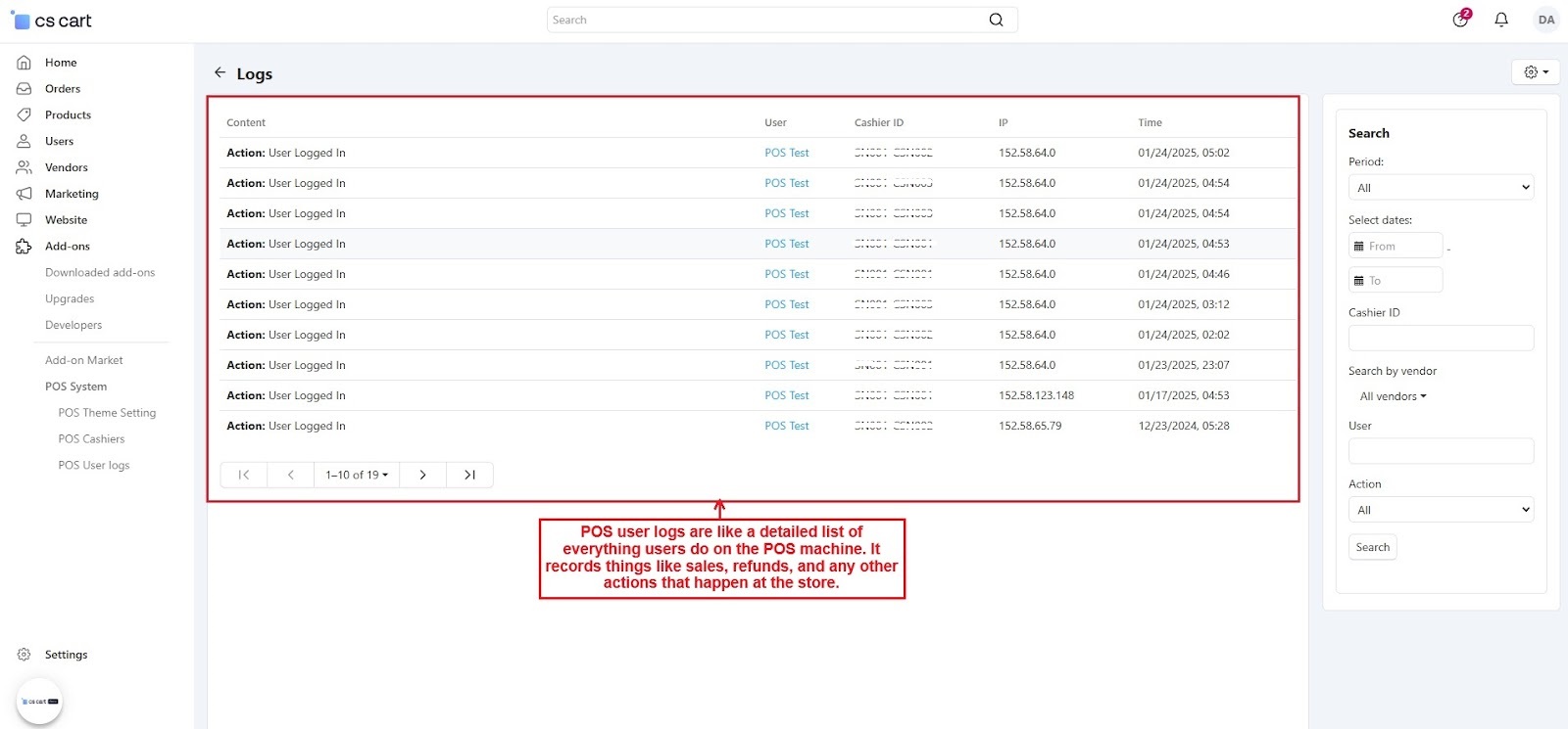 POS user logs are like a detailed list of everything users do on the POS machine. It records things like sales, refunds, and any other actions that happen at the store checkout. These logs are helpful as it check what is going on and make sure everything is running smoothly.
