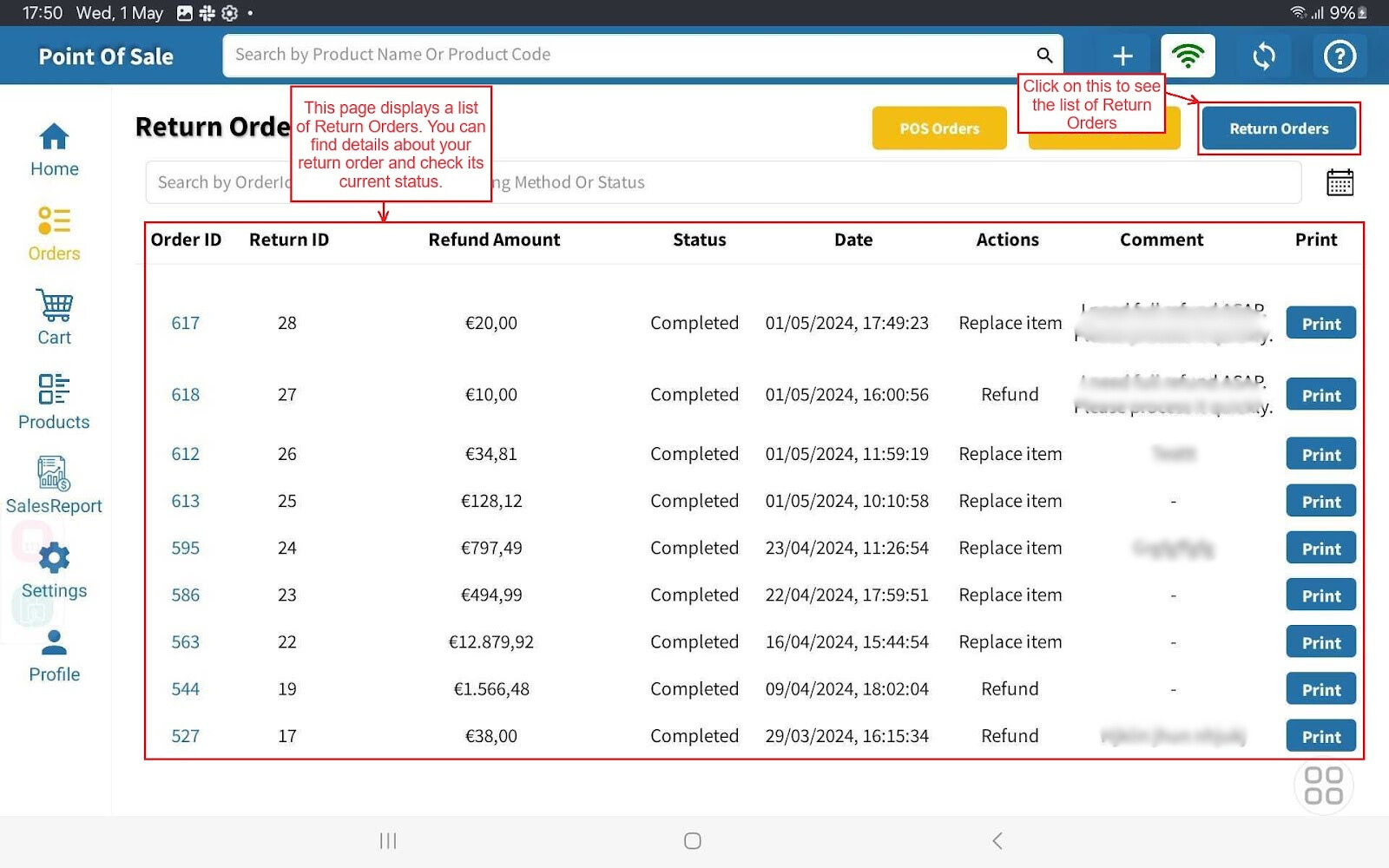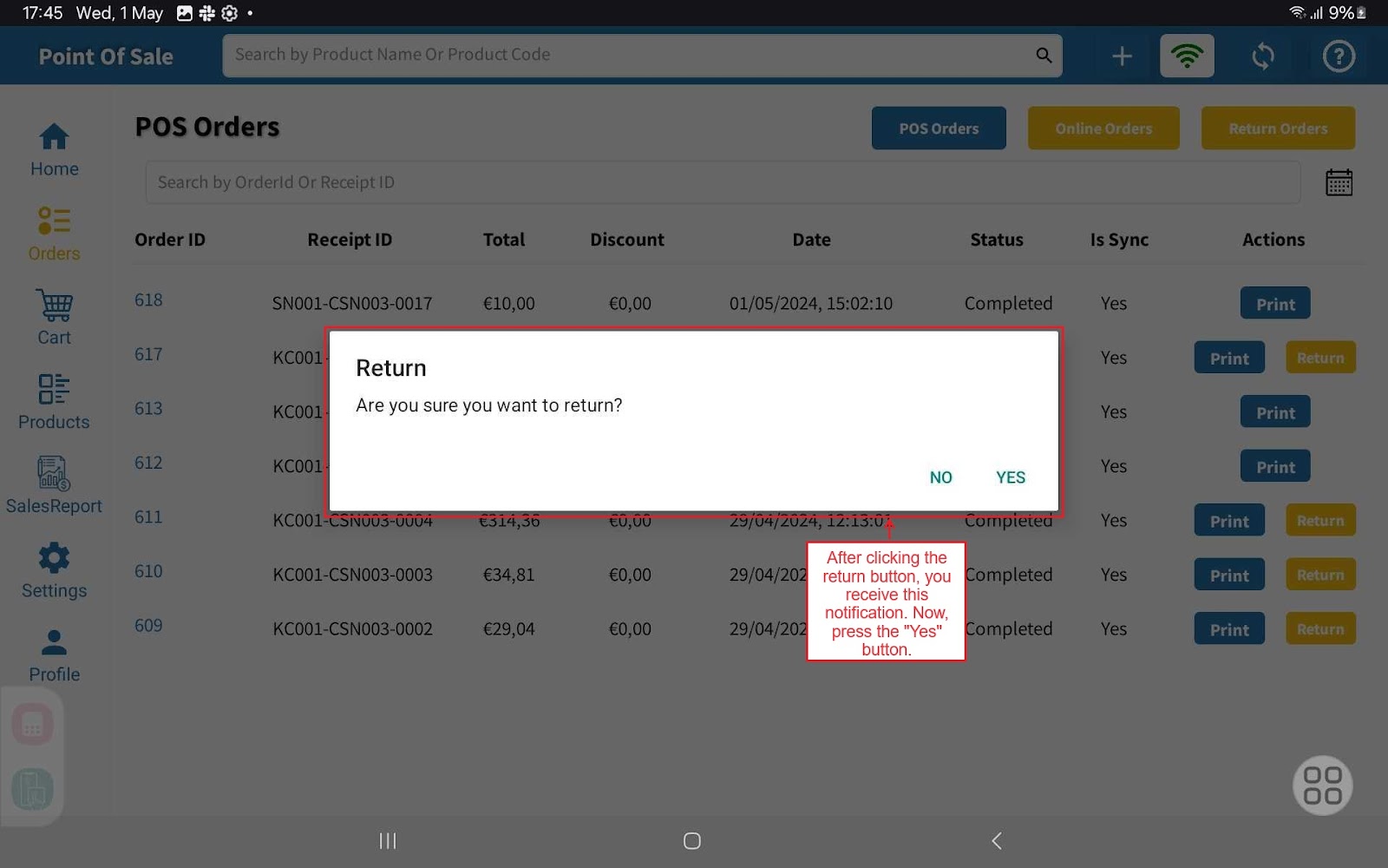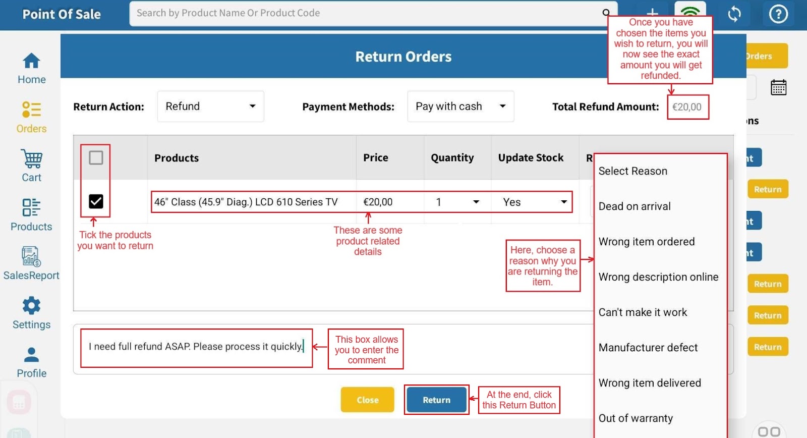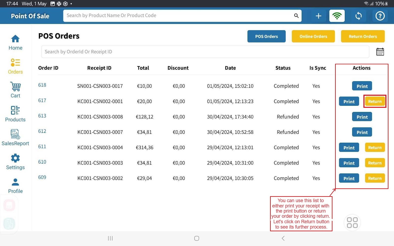 The order menu shows details of POS orders, online orders, and returns. It helps you view order information and also process returns easily.