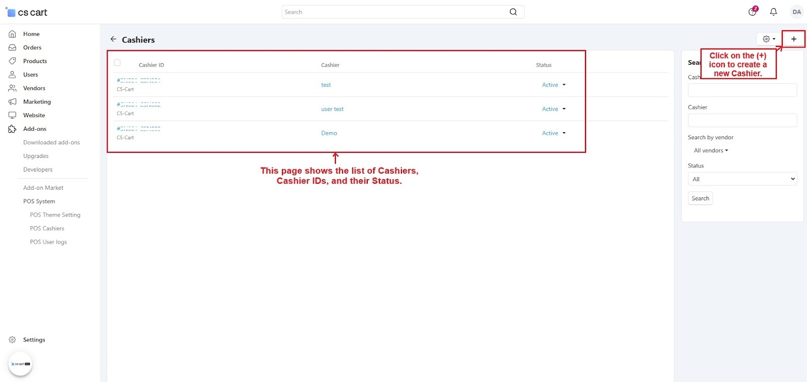 This page shows the list of Cashiers, Cashier IDs, and their Status.