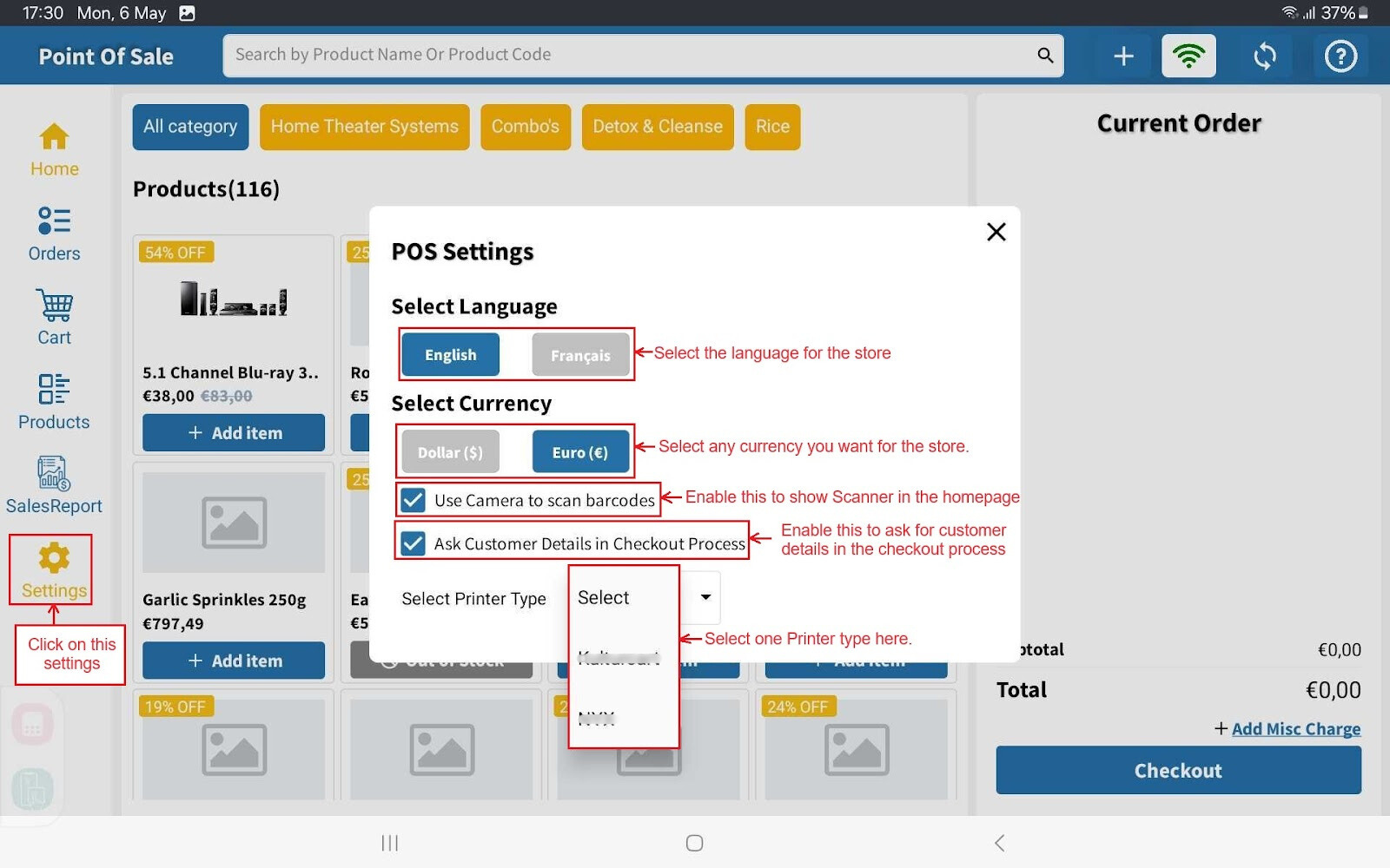 The admin decides what settings POS users can use. These settings include things like adding new products, showing extra charges, and turning on different languages.