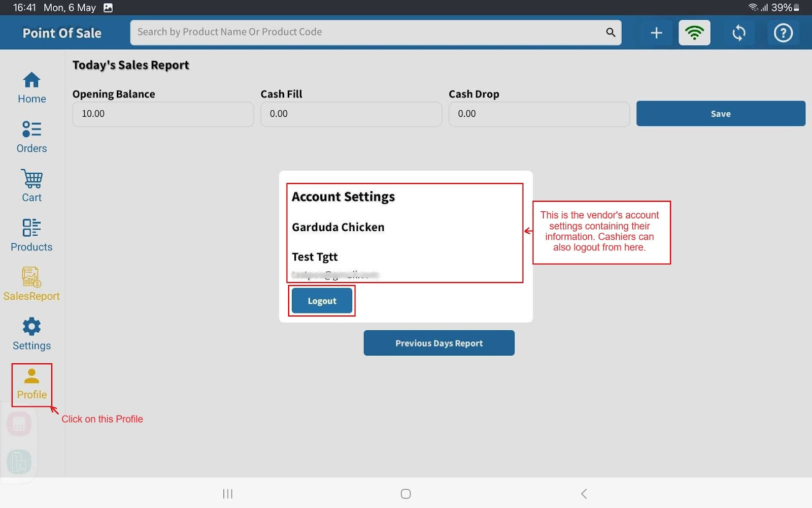 This is the vendor's account settings containing their information. Cashiers can also logout from here.