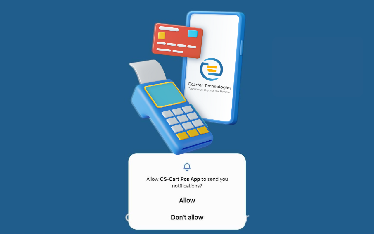 When the user opens the app, a splash screen appears. A notification prompt then asks for permission to send alerts from the CS-Cart POS App.