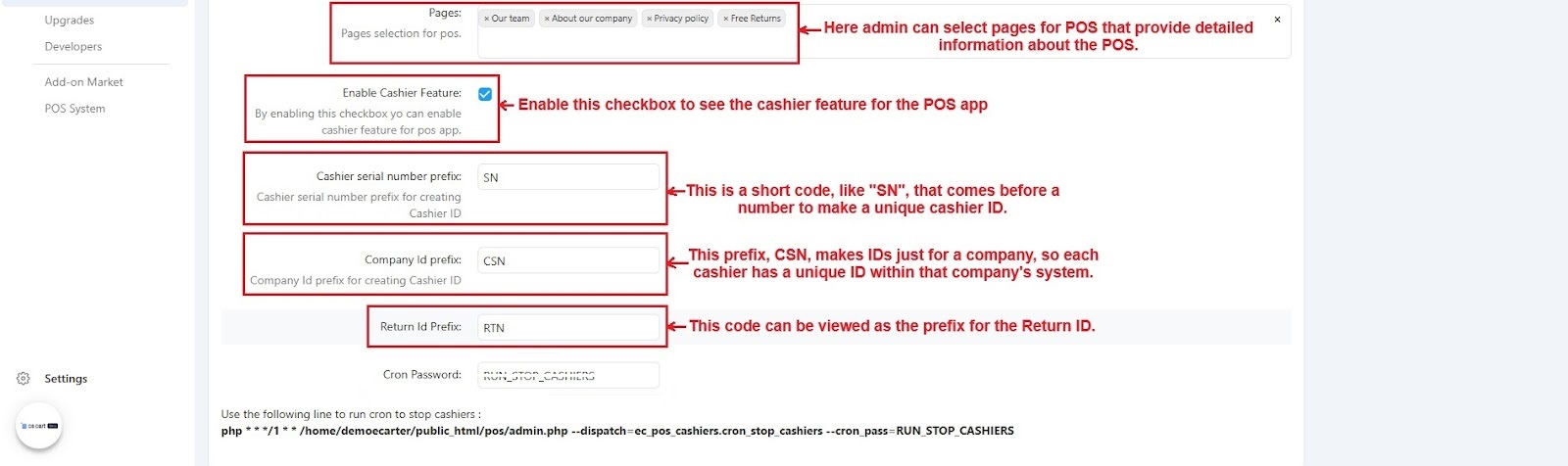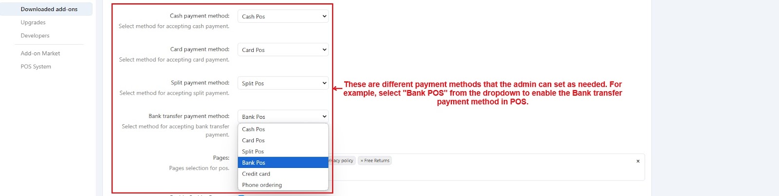 Pages: Admin can select pages for POS that provide detailed information about POS like privacy policy, about our company etc.