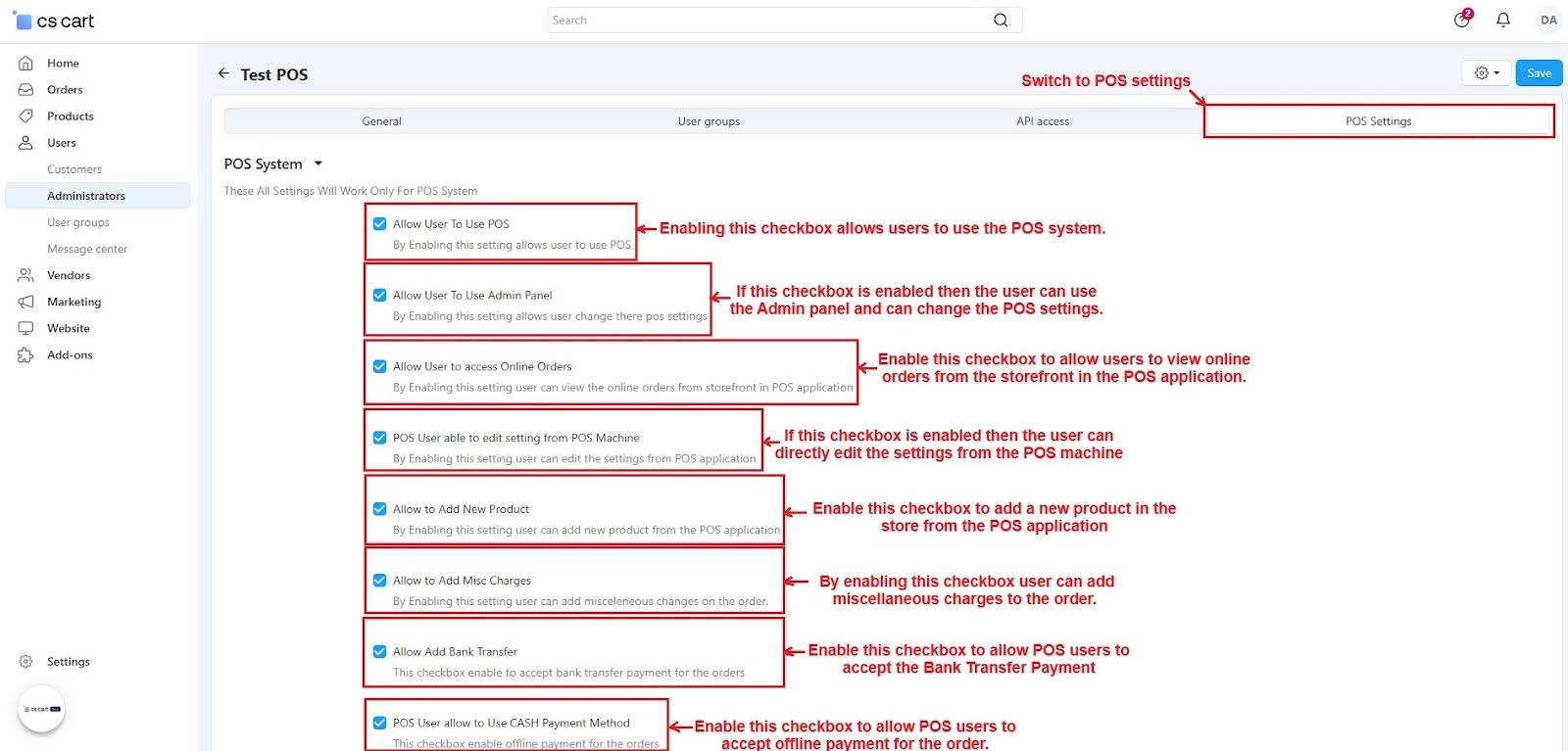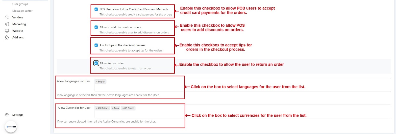Allow User to Use Admin Panel: If this checkbox is enabled then the Users can use the Admin panel and can change the POS settings.