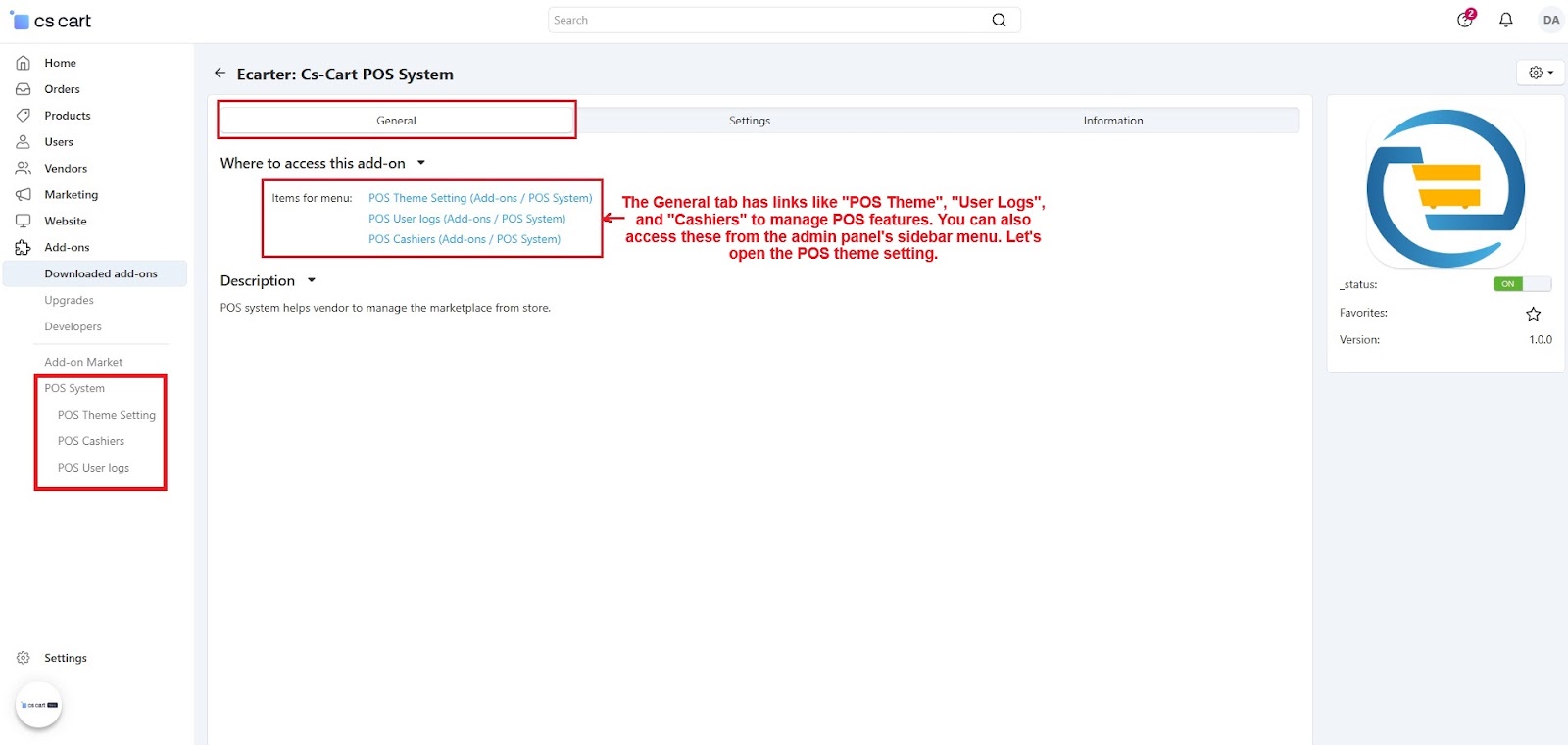 The general tab has links like “POS Theme”, “User Logs”, and “Cashier” to manage POS features.