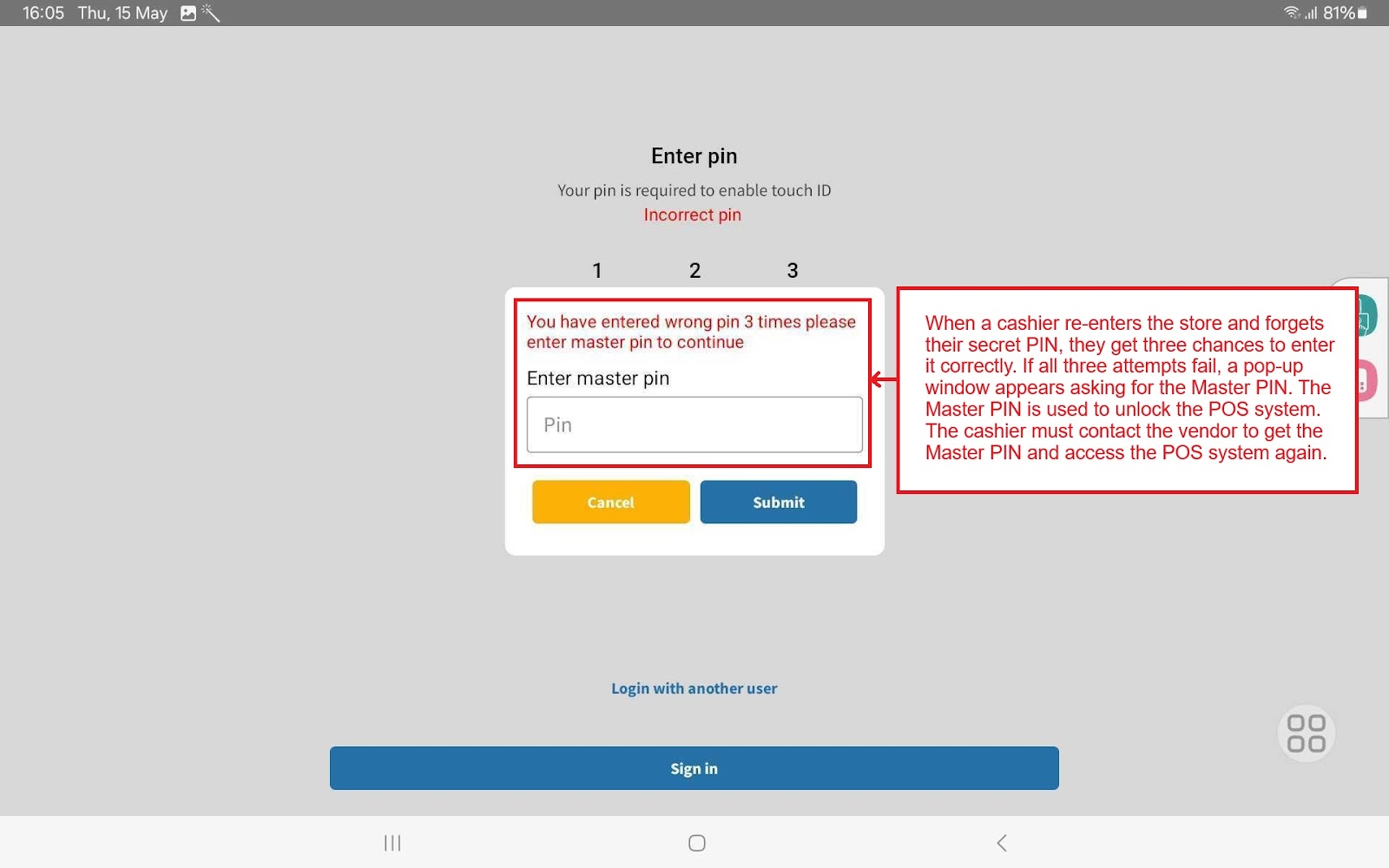When a cashier re-enters the store and forgets their secret PIN, they get three chances to enter it correctly. If all three attempts fail, a pop-up appears asking for the Master PIN. The Master PIN is used to unlock the POS system. The cashier must contact the vendor to get the Master PIN and access the POS system again.