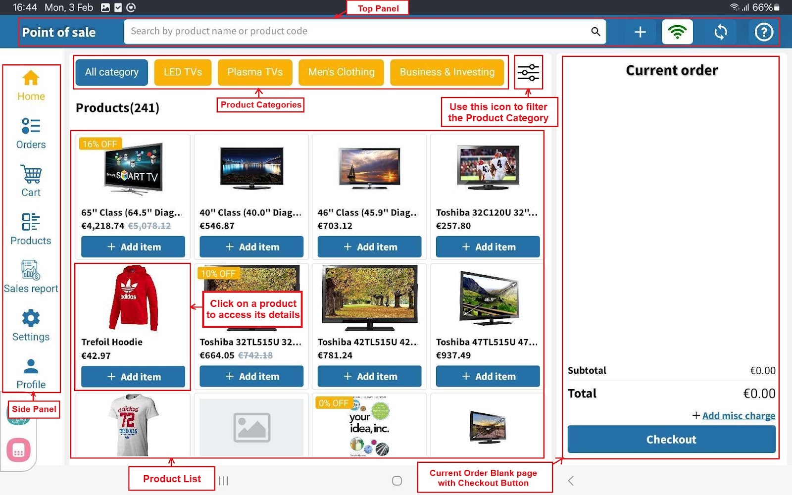 In this homepage, you can view different panels (TOP and SIDE), Product List, Product categories, and current order blank page.