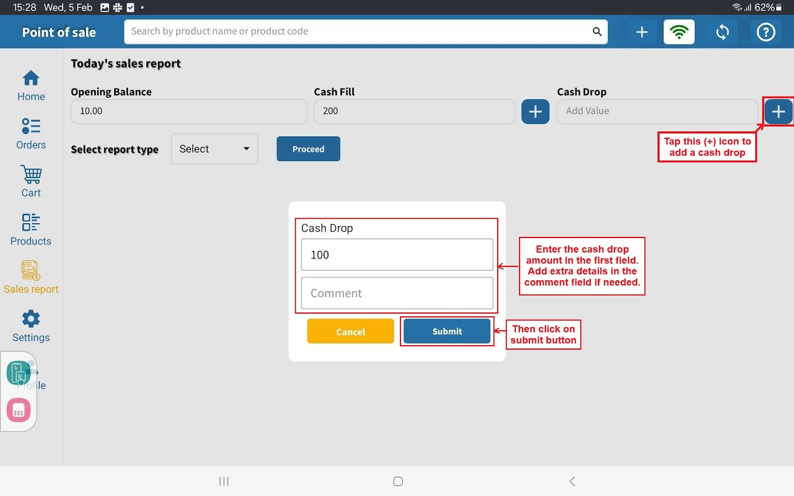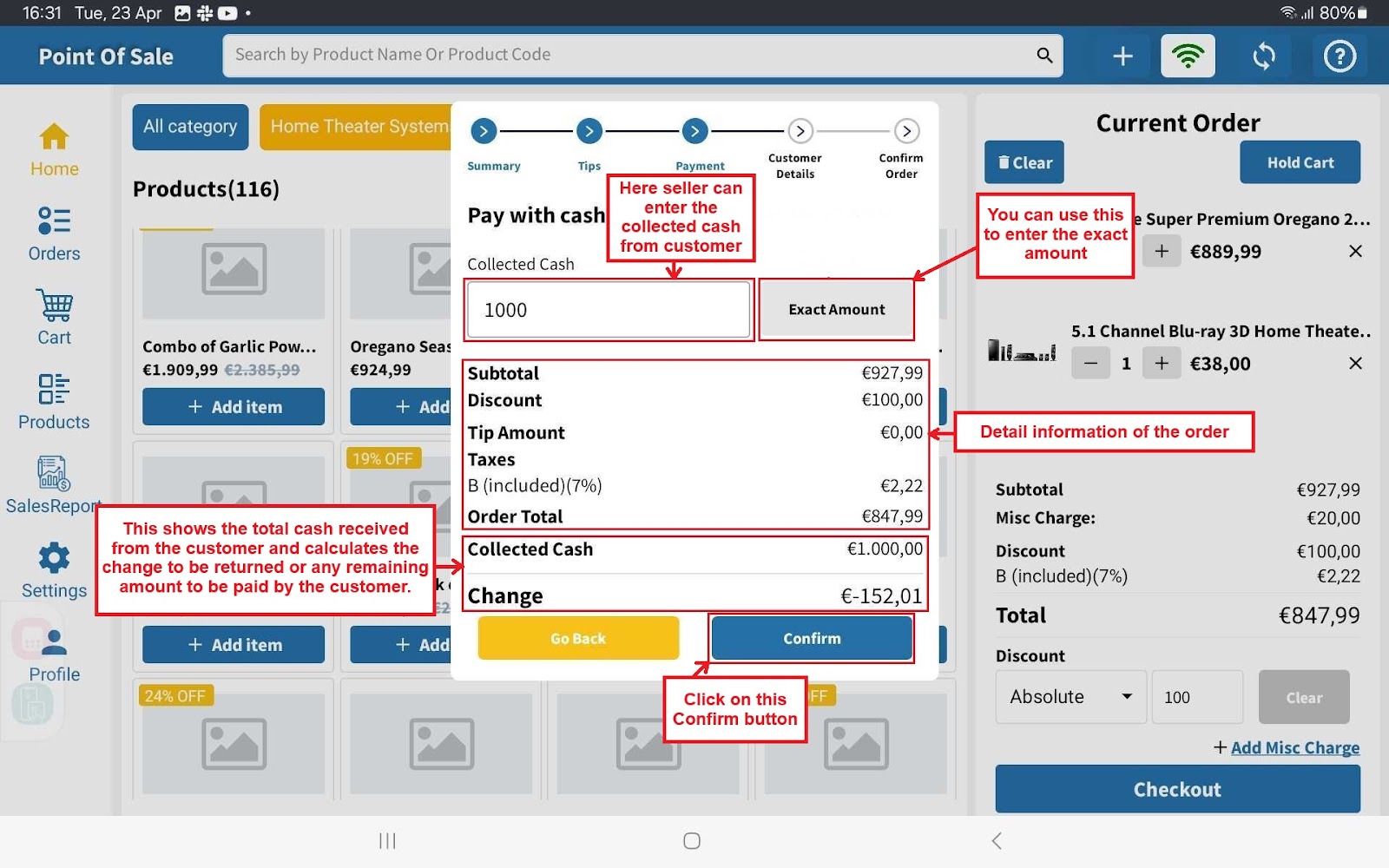 Now, with the cash in hand, the seller can enter the collected amount in “Collected cash” box.