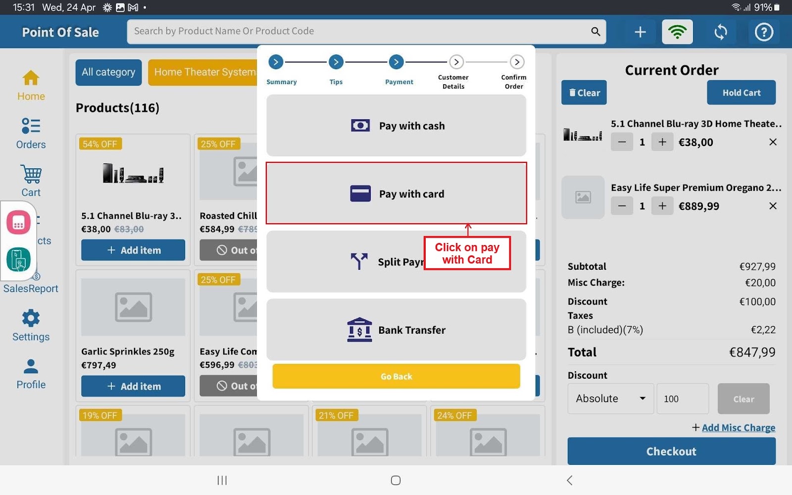 Pay with card is a payment method in a POS system where customers use their cards to complete transactions. This method processes payments using the card information entered by the customer.