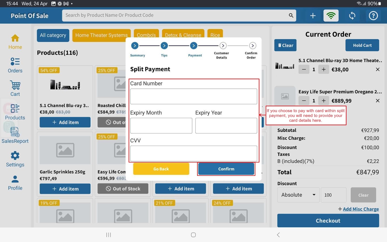 Split payment method: To accept payment using the split payment method, select the split POS option.