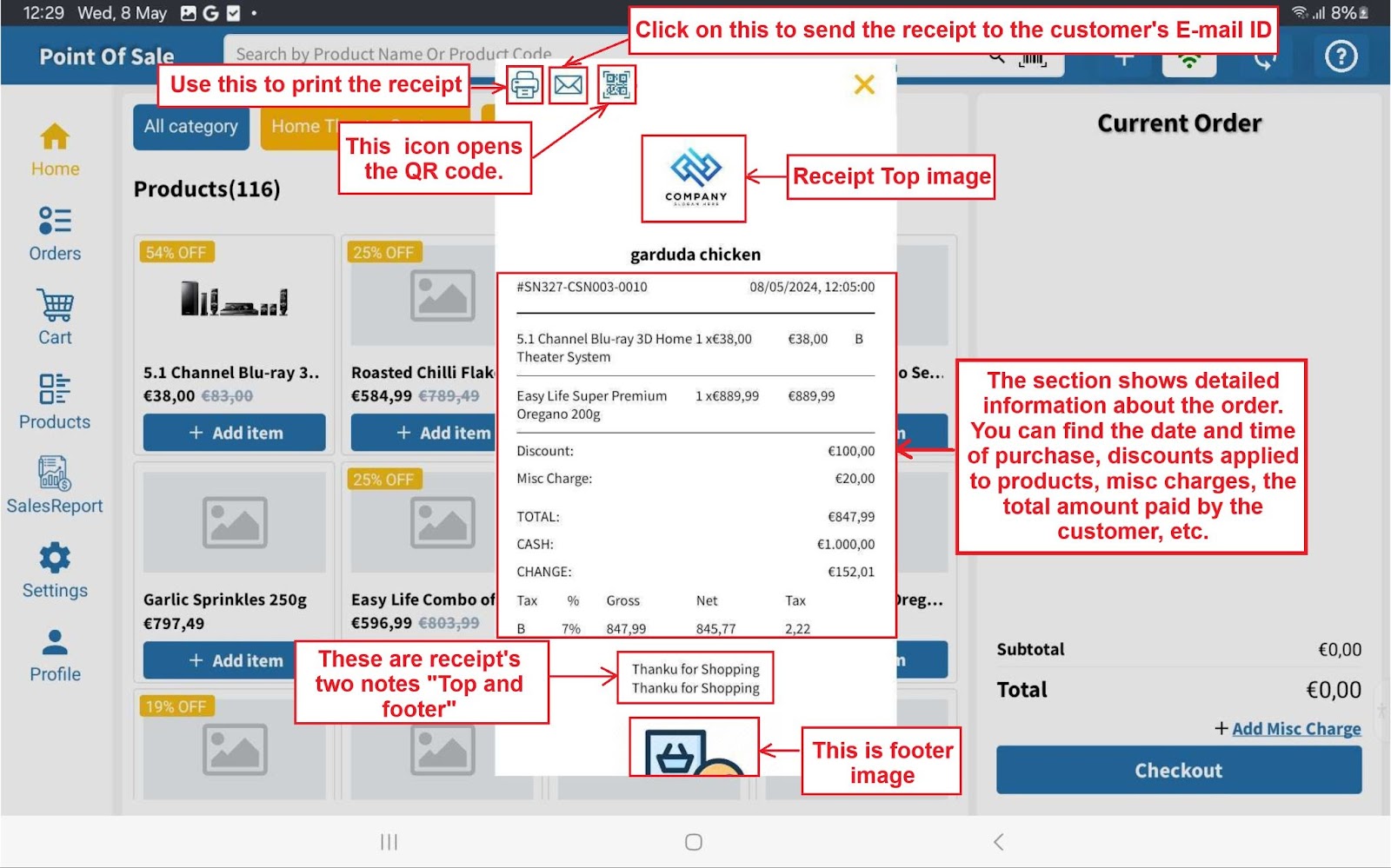 Receipt note: This feature allows vendors to add special messages or important information to the sales receipt, like saying thank you or explaining return policies. Also, enable the checkbox to see the receipt note.