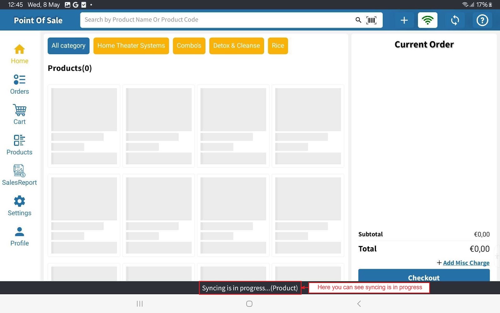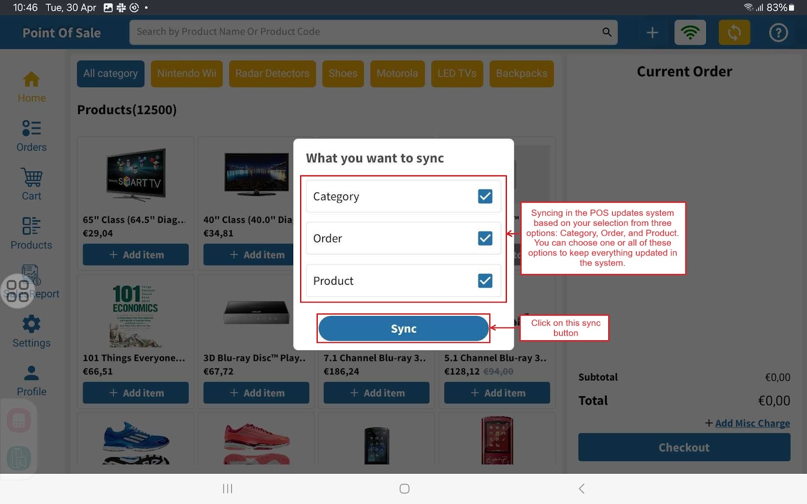 “Syncing” keeps everything updated with three options: categories, orders, and products.