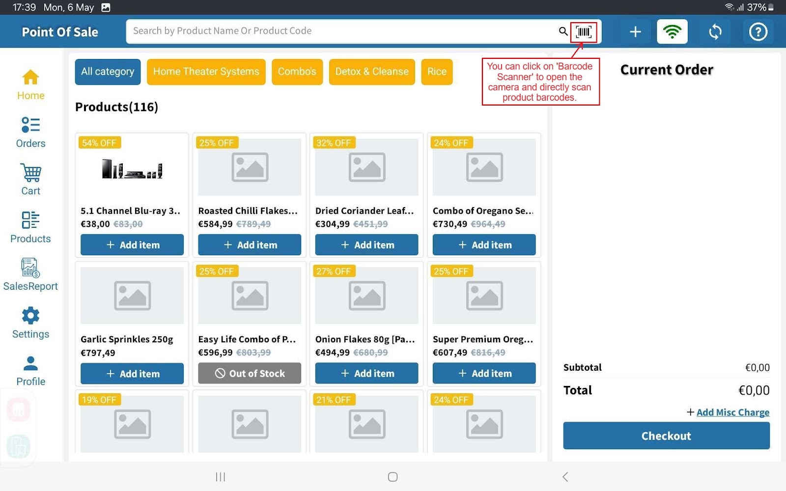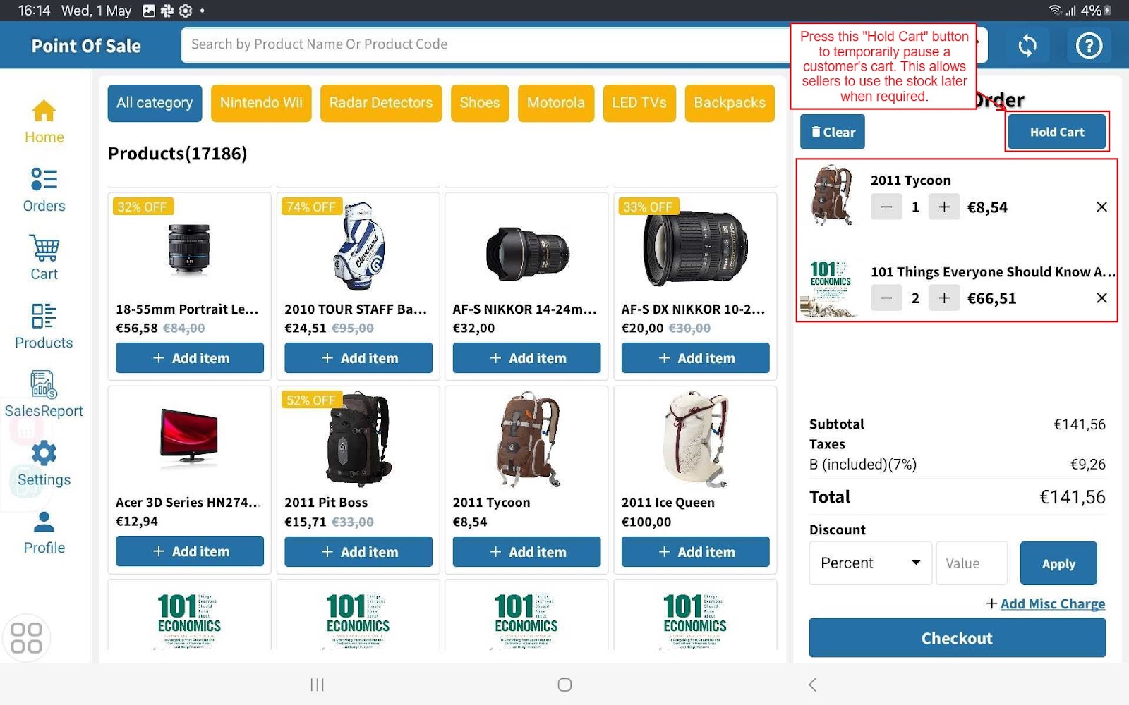 Some inner features of POS include discount, pausing carts with Hold Cart, generating receipts via email or QR code, and tracking sales with X-Reports and Z-Reports. The app syncs to update categories, orders, and products in real-time. It accepts various payments, handles miscellaneous charges, and also allows new product additions. Basically, it's a simple and easy-to-use app that helps stores run smoothly and efficiently.