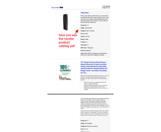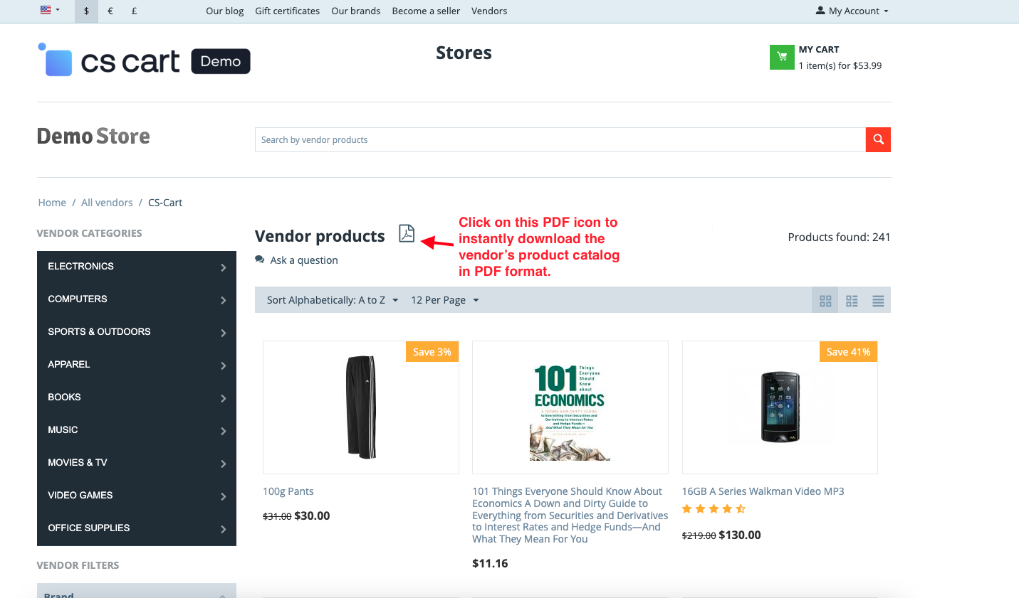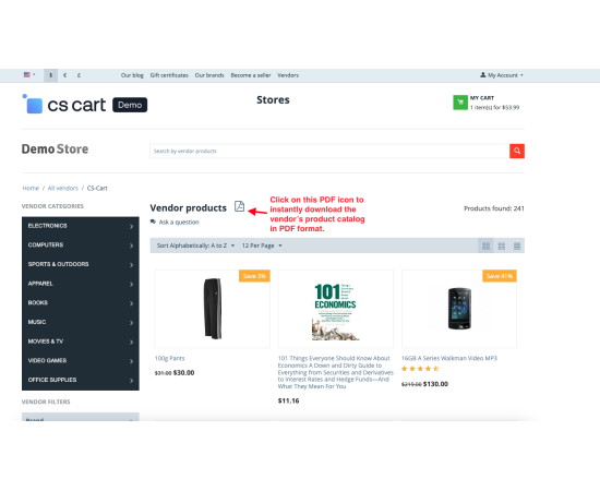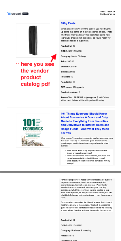 - Vendor Page PDF: instantly download a catalog of all products listed by the vendor in PDF format.