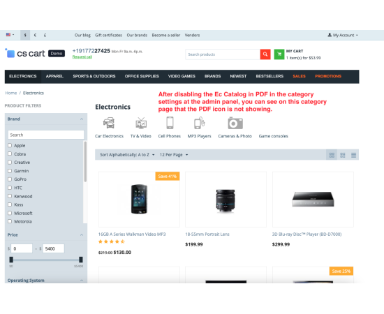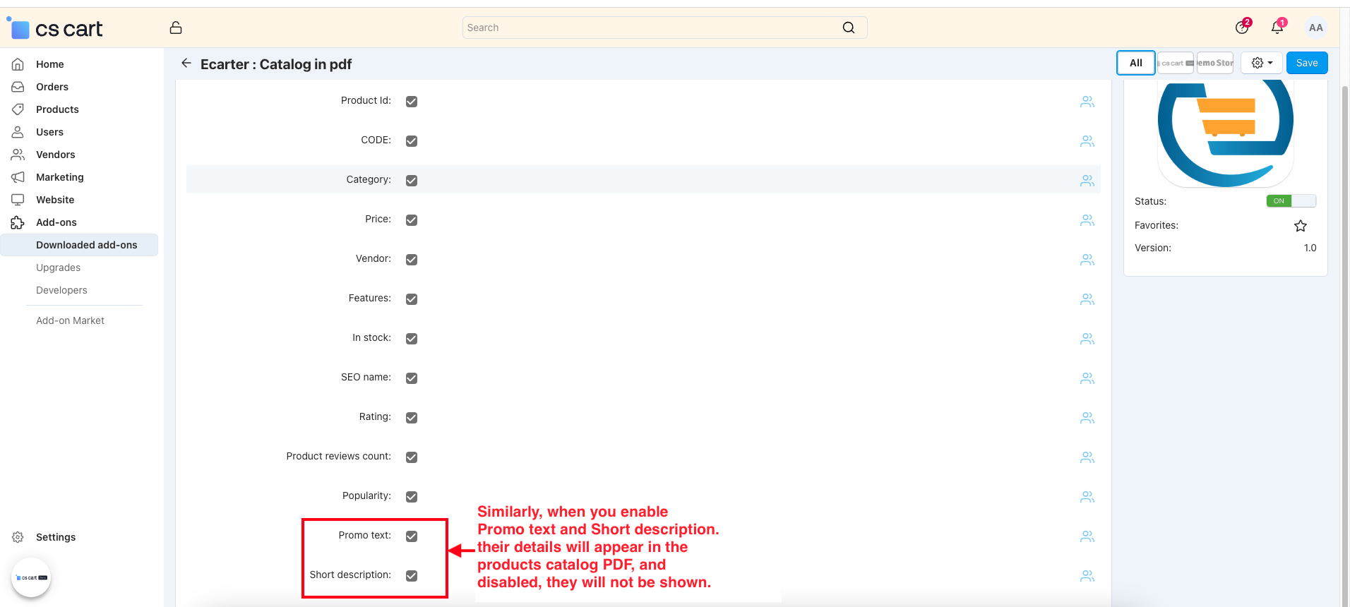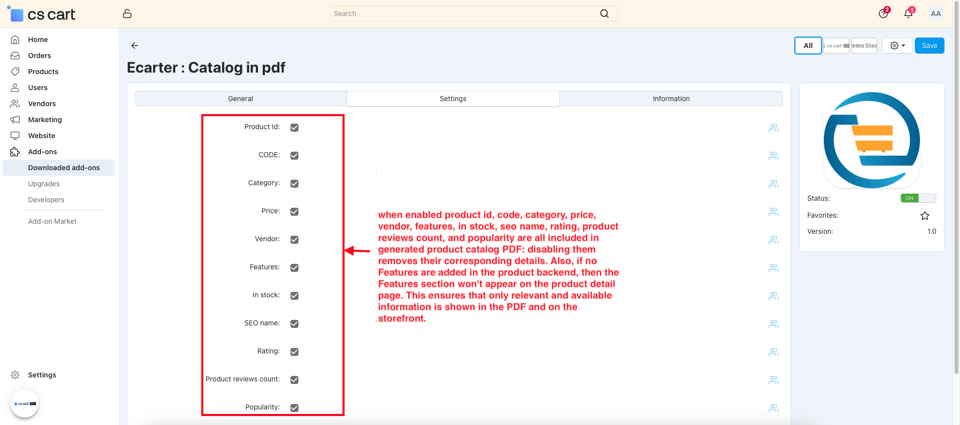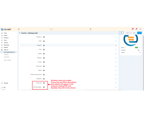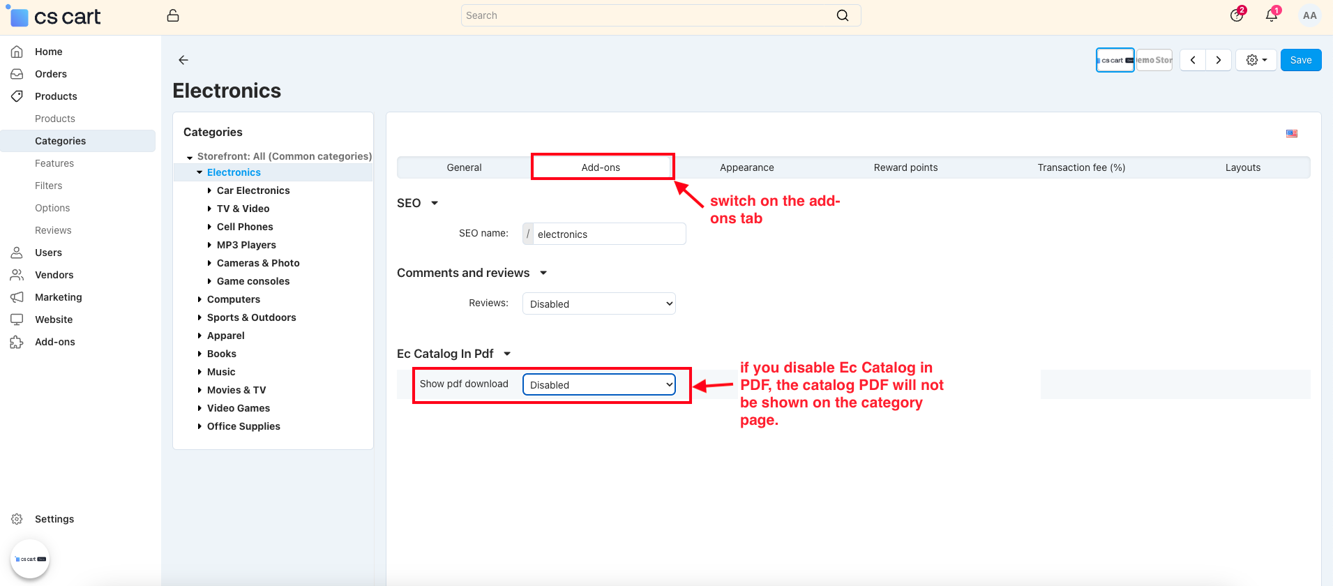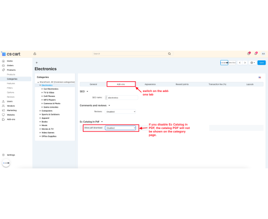 - On/Off control: Admin can enable or disable the PDF catalog option for categories from the addon settings.
