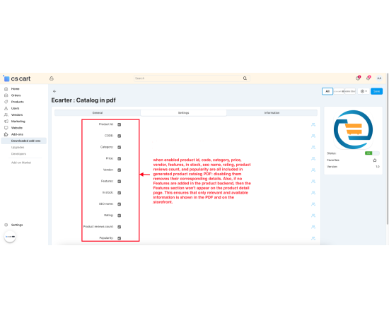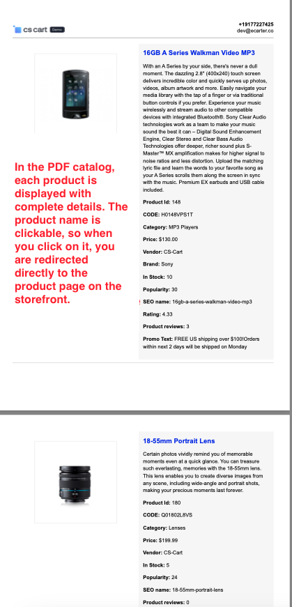 The CS-Cart Catalog in PDF addon lets store admins create neat product catalogs as PDF files. Customers can download these catalogs from category, search, or vendor pages to view offline. Each PDF can show product images, names, descriptions, prices, vendor details, stock status, features, ratings, reviews, and more. Admins can choose which information to include, so only the needed details appear. Product names in the PDF are clickable and open the product page on the store. It also helps customers easily compare products without visiting the website repeatedly. The PDF catalogs make sharing product information simple and professional. Overall, it saves time for both store owners and customers while improving the shopping experience.