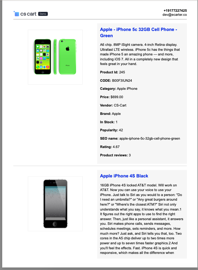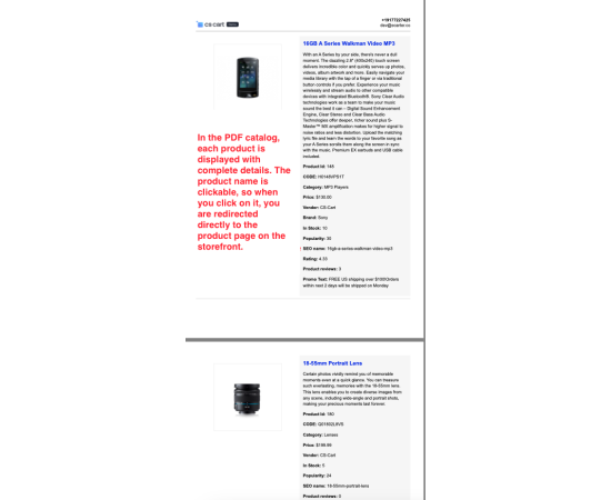- Complete Product Information: PDF includes product images, name, features, descriptions, stock status, and more.