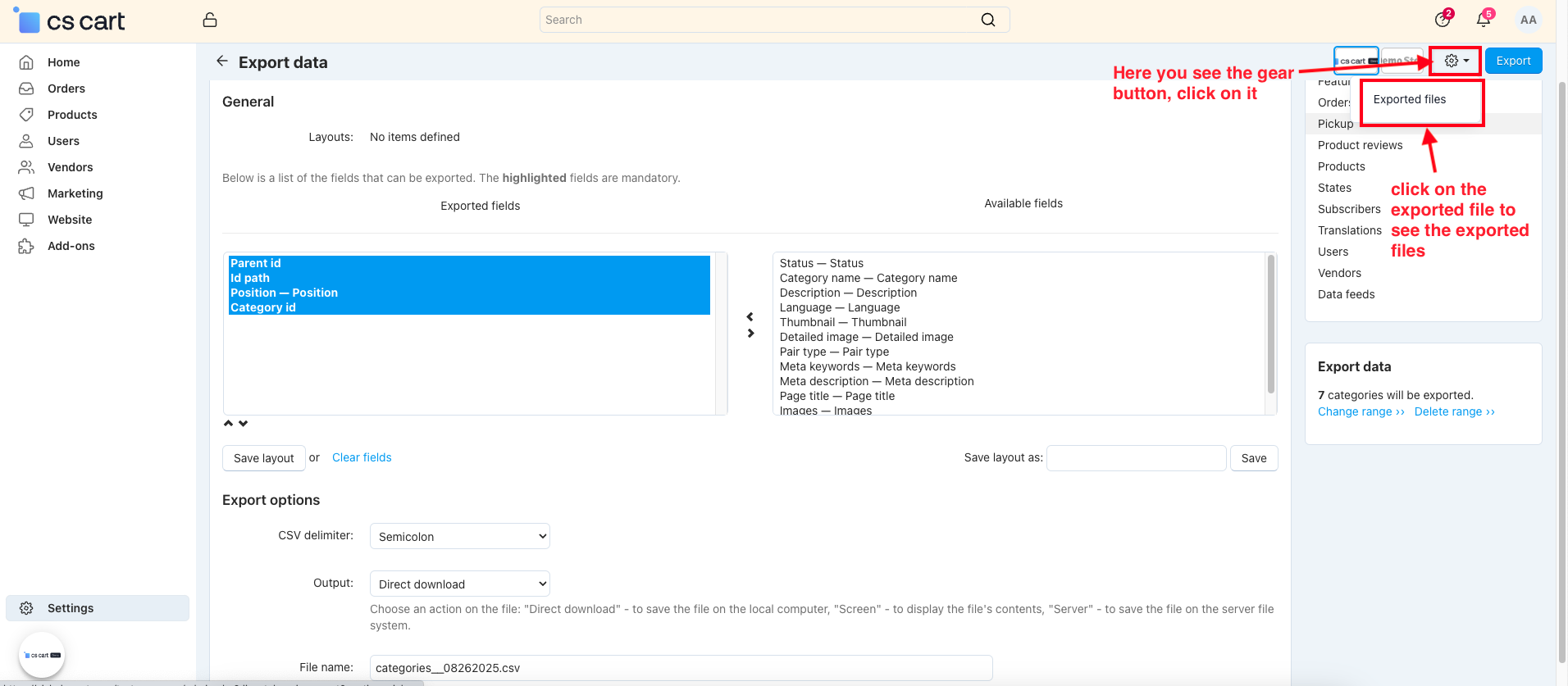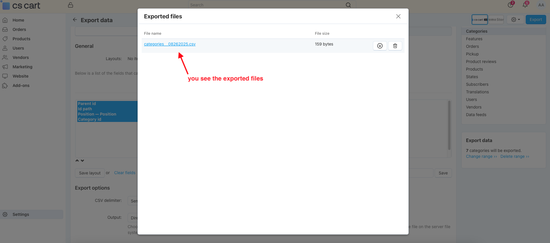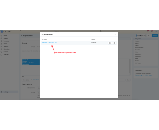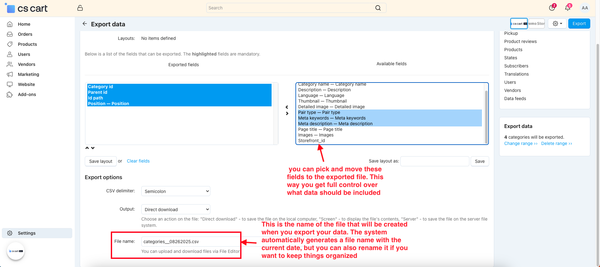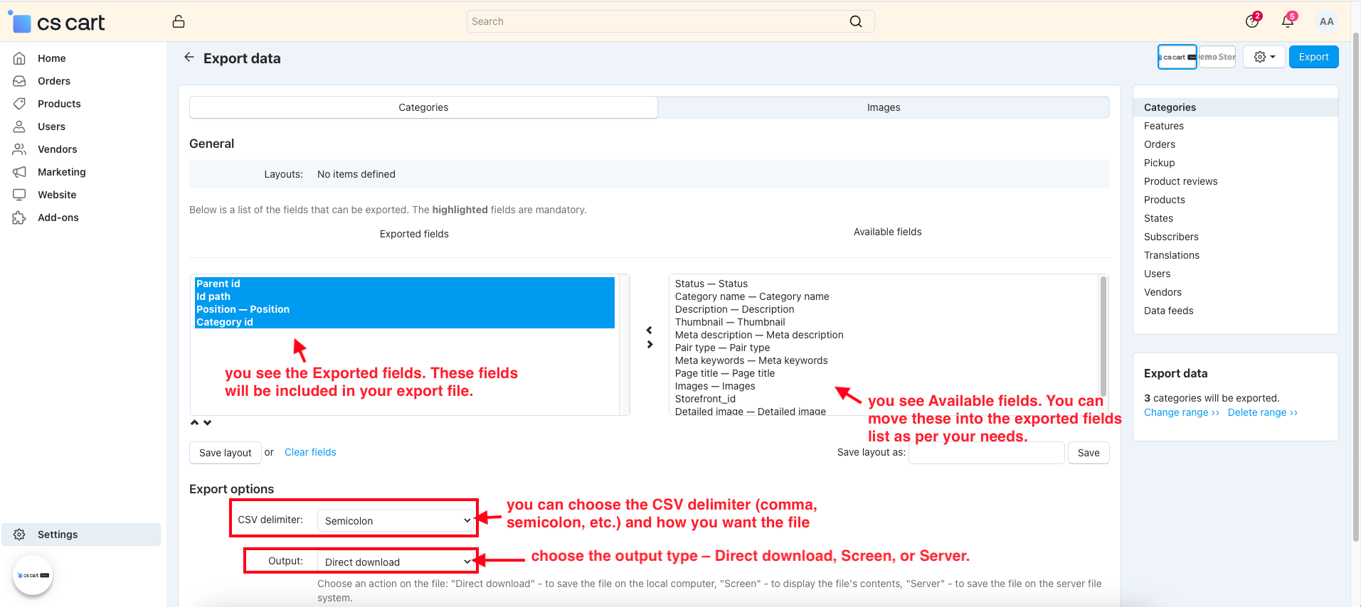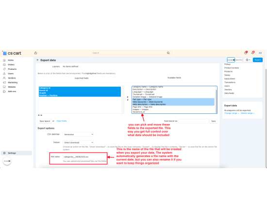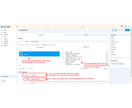 The CS-Cart Category Import Export addon helps store owners manage categories quickly and in bulk. You can easily export category data with selected fields, rename files, and set CSV options. For importing, you can upload multiple categories at once from your computer, server, or URL. Important fields like Category ID, Parent ID, Path, and Position are checked, along with optional details such as descriptions, images, and meta tags.