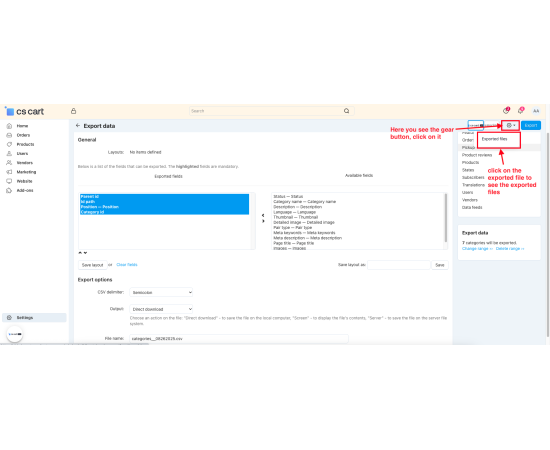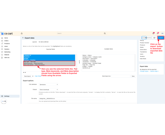- Available & Exported Fields: Choose which fields you want to include in your exported file and arrange them as needed.